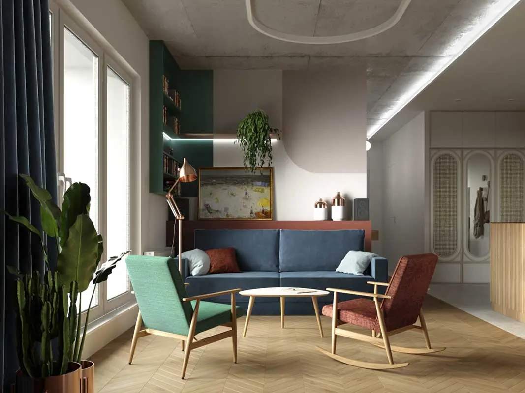 Styl mieszkania nawiązuje do klimatu lat 60. Jednocześnie znajdziemy tu wiele praktycznych rozwiązań, zgodnych ze współczesnymi standardami. W projekcie nie brakuje również odniesień do lat 50. ubiegłego stulecia, kiedy to w Stanach Zjednoczonych miejscowi artyści postanowili zagospodarować opuszczone fabryki. Ten moment uznaje się za początek stylu industrialnego. Surowy żelbeton na suficie, który udało się pozostawić na etapie zmian deweloperskich, kontrastuje z żywymi kolorami, przytulnymi materiałami i elementami w stylu vintage a całemu projektowi nadaje lofotowy smaczek.