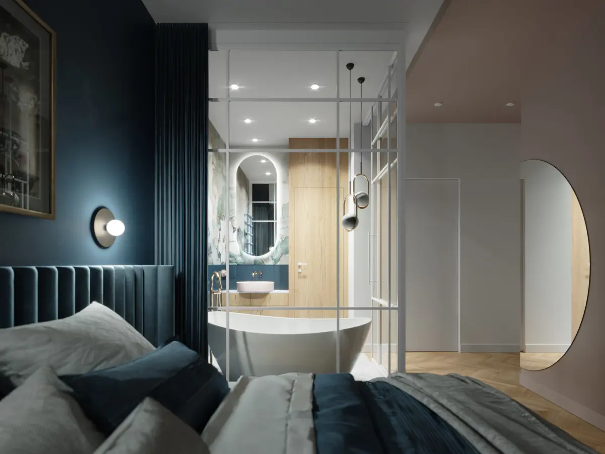 Sypialnię połączono z przeszklonym pokojem kąpielowym, dzięki czemu projekt zyskał na przestrzenności. Mosiężne wykończenia lamp, uchwytów i baterii dodają wnętrzu charakteru. Wodoodporna tapeta od Wall&Deco obecna w strefie umywalkowej łączy pomieszczenia, które pomimo zupełnie różnych funkcji stworzyły harmonijną jedność.