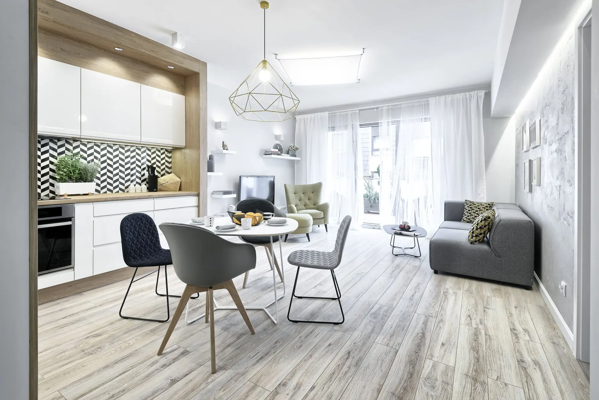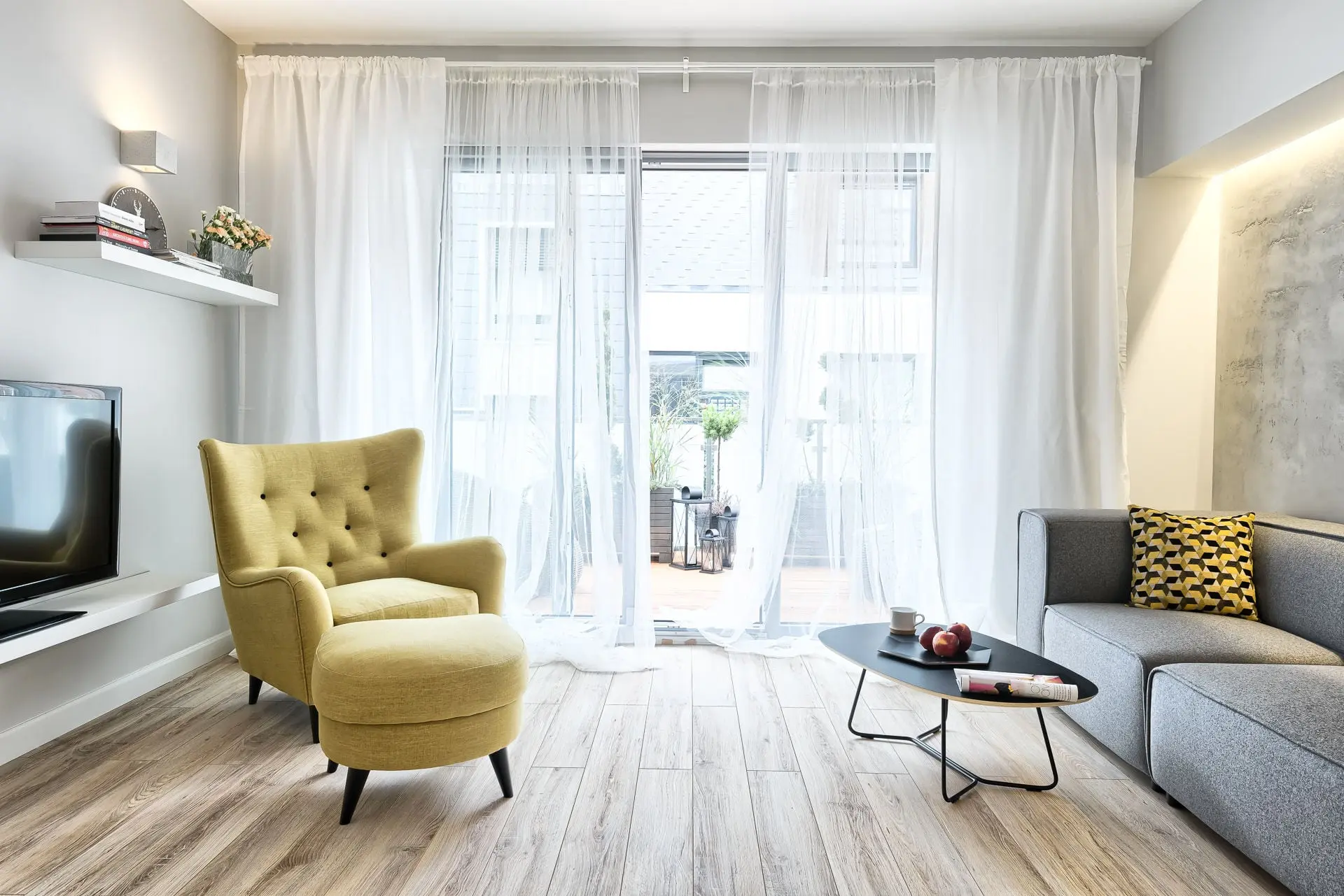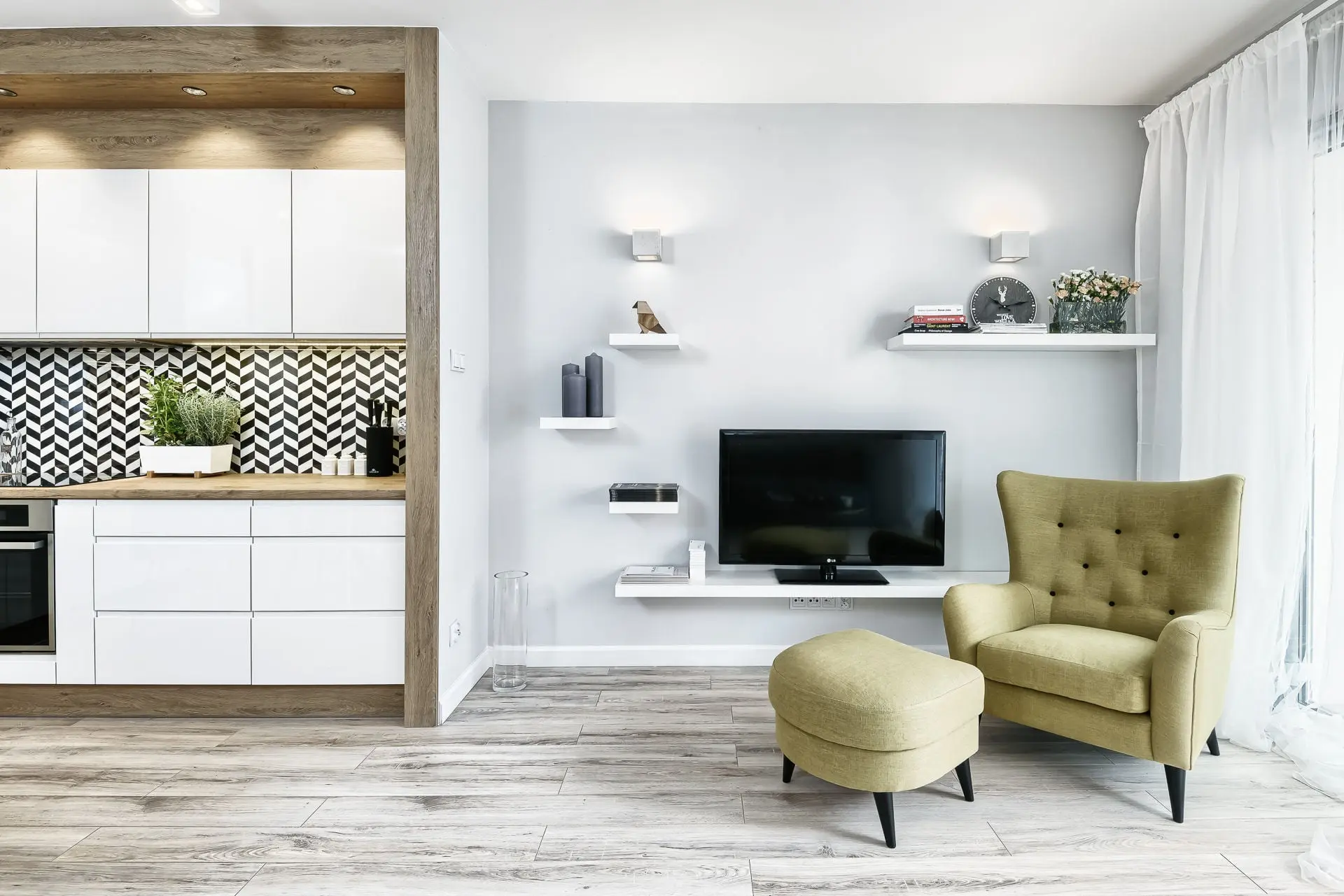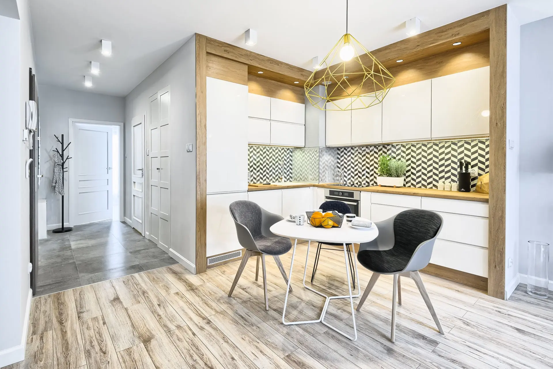 Stylowe mieszkanie, w którym drewno i ciepły żółty kolor ociepla surowy skandynawski styl.