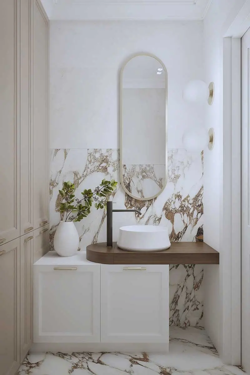 W obu łazienkach główną rolę odgrywa zjawiskowy marmur, który połączony z ciekawą drewnianą zabudową podumywalkową stanowi zgrany duet.