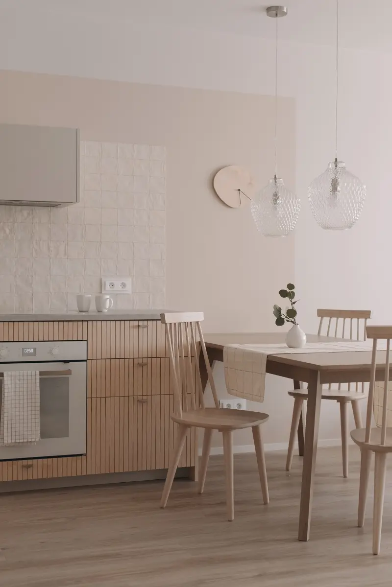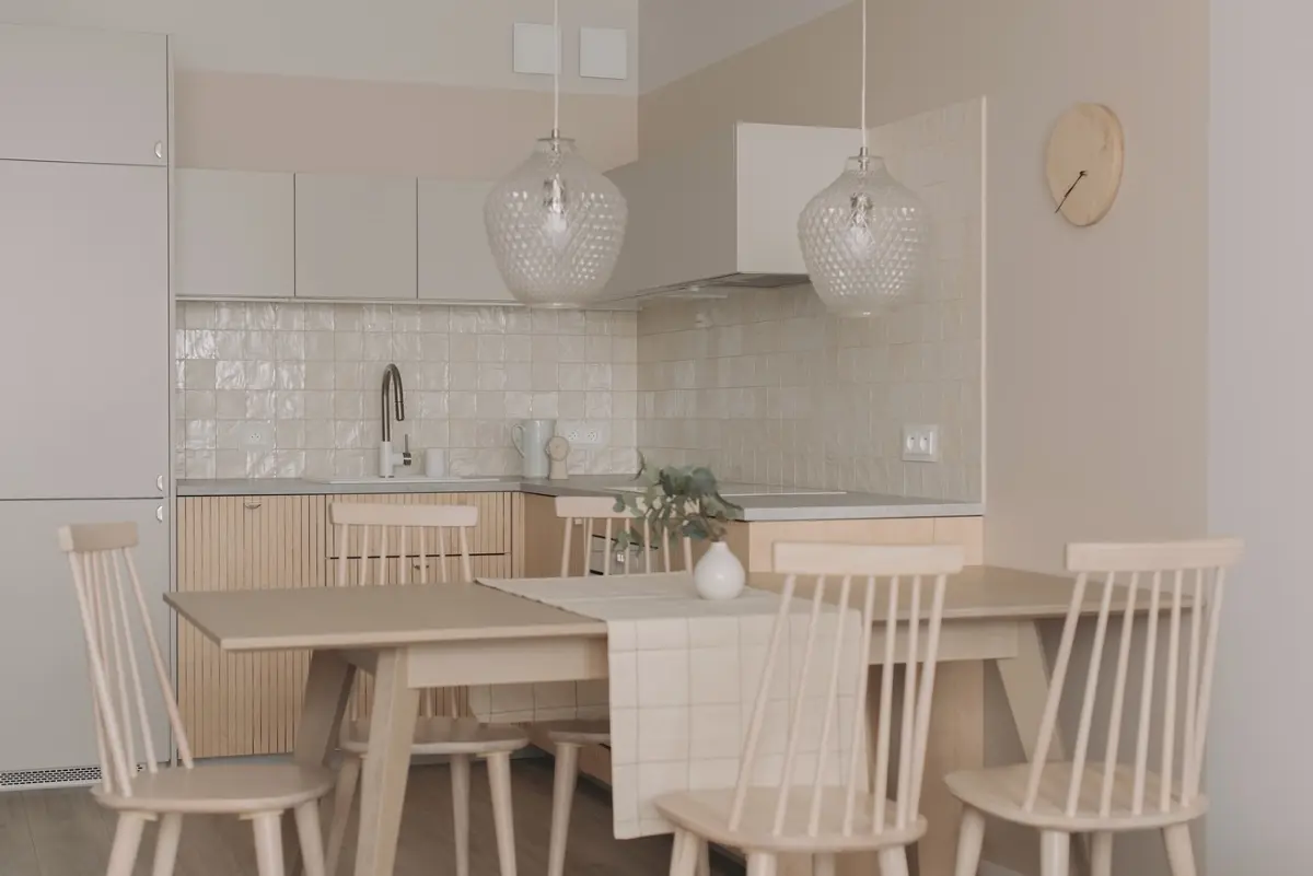 Architektki zdecydowały się na przykucie uwagi potencjalnych wynajmujących, geometrycznymi detalami. Bardzo nieoczywiste dekoracje, pięknie wybrzmiewają na tle minimalistycznej aranżacji i stanowią współczesny kontekst projektu. Aneks kuchenny został wyznaczony poprzez wysoką lamperię w kolorze pastelowego beżu, natomiast na niej, do 3/4 wysokości umieszczono płytki. Dało to efekt, rozszerzających się ku salonowi, ram. Zabawy geometrią odnajdziemy także w pozostałych pomieszczeniach, np. za sprawą minimalistycznych grafik. Wyjątkowa harmonia wnętrza została osiągnięta, właśnie dzięki tej nienachalnej geometrii, wyrażonej nie tylko poprzez dekoracje, ale również wybór mebli i elementów wyposażenia.