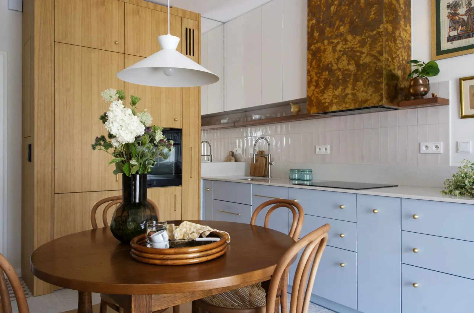 Centralnym punktem mieszkania jest drewniany stół o kawiarnianym charakterze, który zaprasza do wspólnego spędzania czasu, rozmów przy kawie czy niespiesznych posiłków. Wnętrze kuchni zdobi błękitno-kremowa zabudowa z charakterystycznym mosiężnym okapem, która nawiązuje do stylu secesyjnego, ale w nowoczesny sposób.