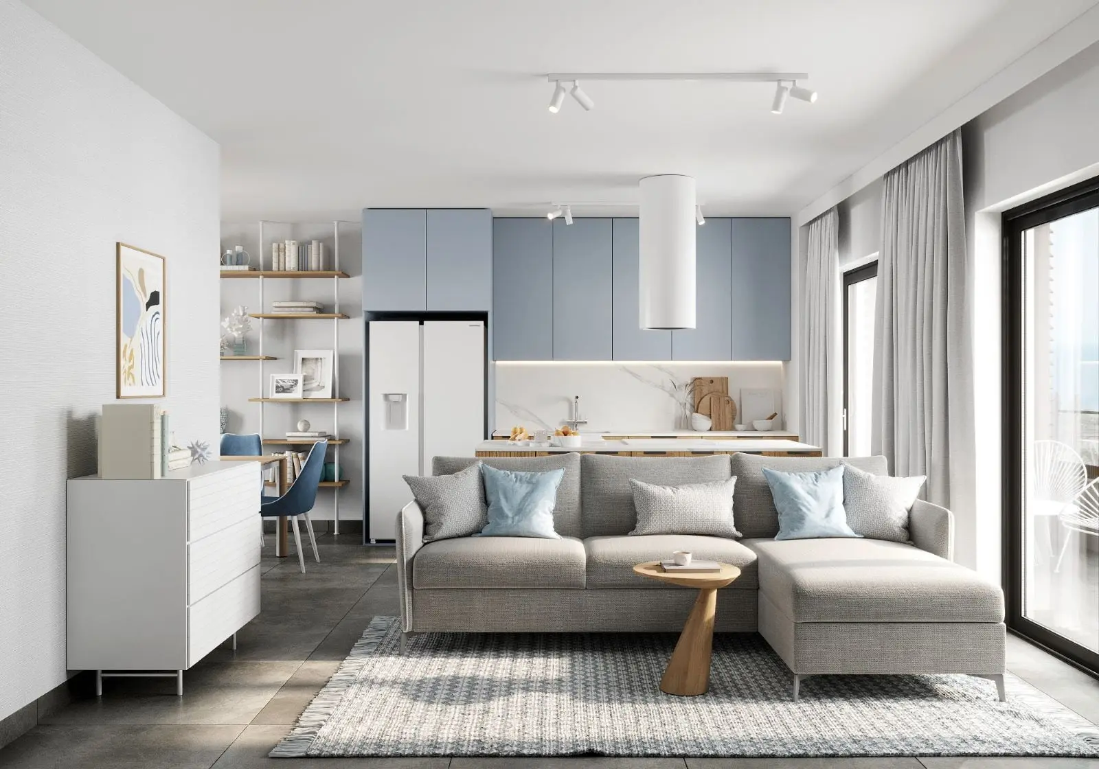 Wnętrze tego apartamentu jest hołdem dla natury i piękna, jakie oferuje nam Chorwacja. Paleta kolorów, składająca się z odcieni niebieskiego, bieli i elementów drewna, tworzy harmonię, która uspokaja zmysły i wizualnie łączy przestrzeń z otaczającym pejzażem. Błękitne akcenty nawiązują do błękitu nieba oraz wód Adriatyku, przynosząc uczucie spokoju i swobody. Biel dział jak płótno, na którym grają światła i cienie, dodając przestrzeni elegancji i czystości. Elementy drewna wprowadzają ciepło i autentyczność przypominając o naturze i tradycji tego miejsca. Każdy szczegół został starannie dobrany, aby zapewnić mieszkańcom komfort na najwyższym poziomie.