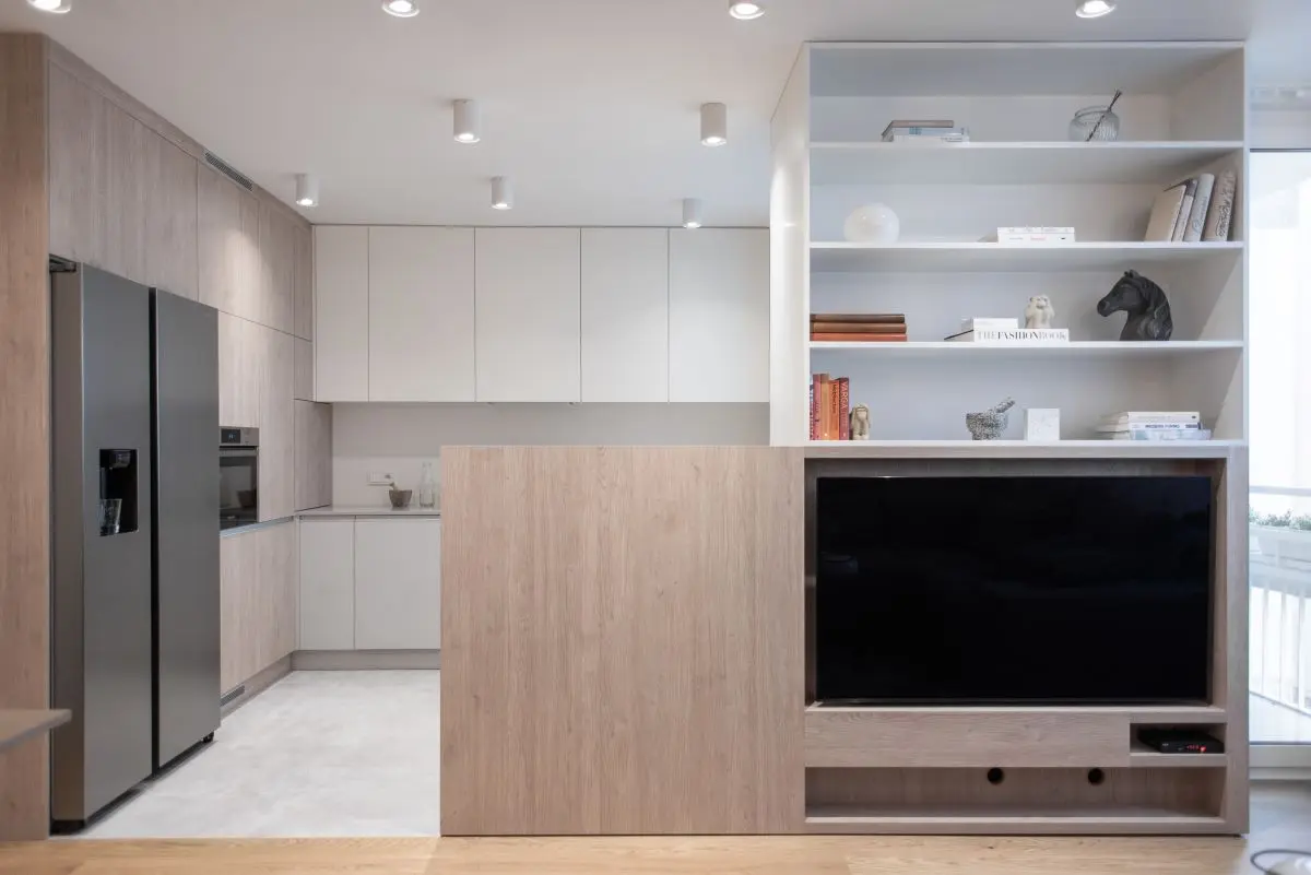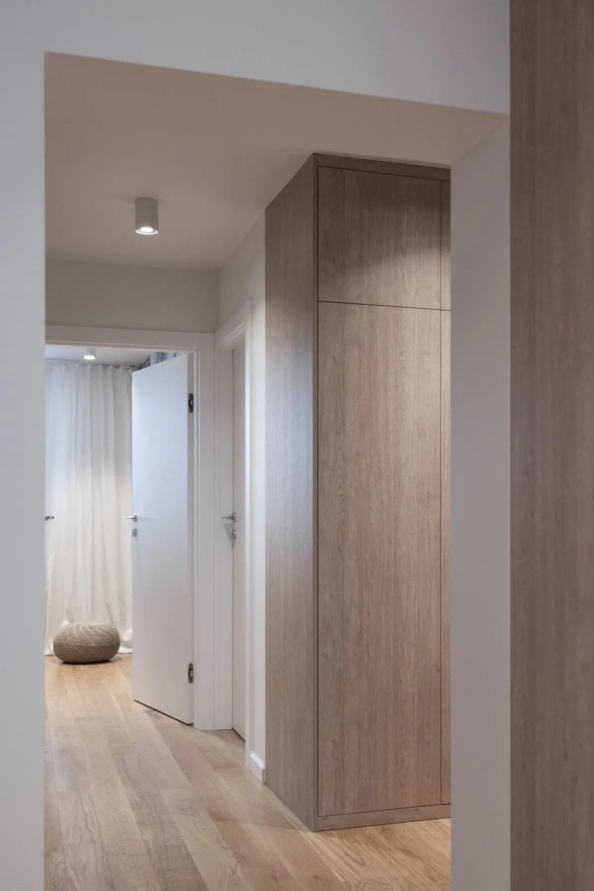 Funkcjonalność przechowywania i dobra organizacja skrytek były priorytetem projektu. Charakter pomieszczeń definiują duże płaszczyzny wielofunkcyjnych mebli. Mieszkanie w bloku z wielkiej płyty jest dość spore lecz było ciasne i nie funkcjonalne. O znakomitą aranżację wnętrza zadbało biuro architektoniczne Monarchia Design.