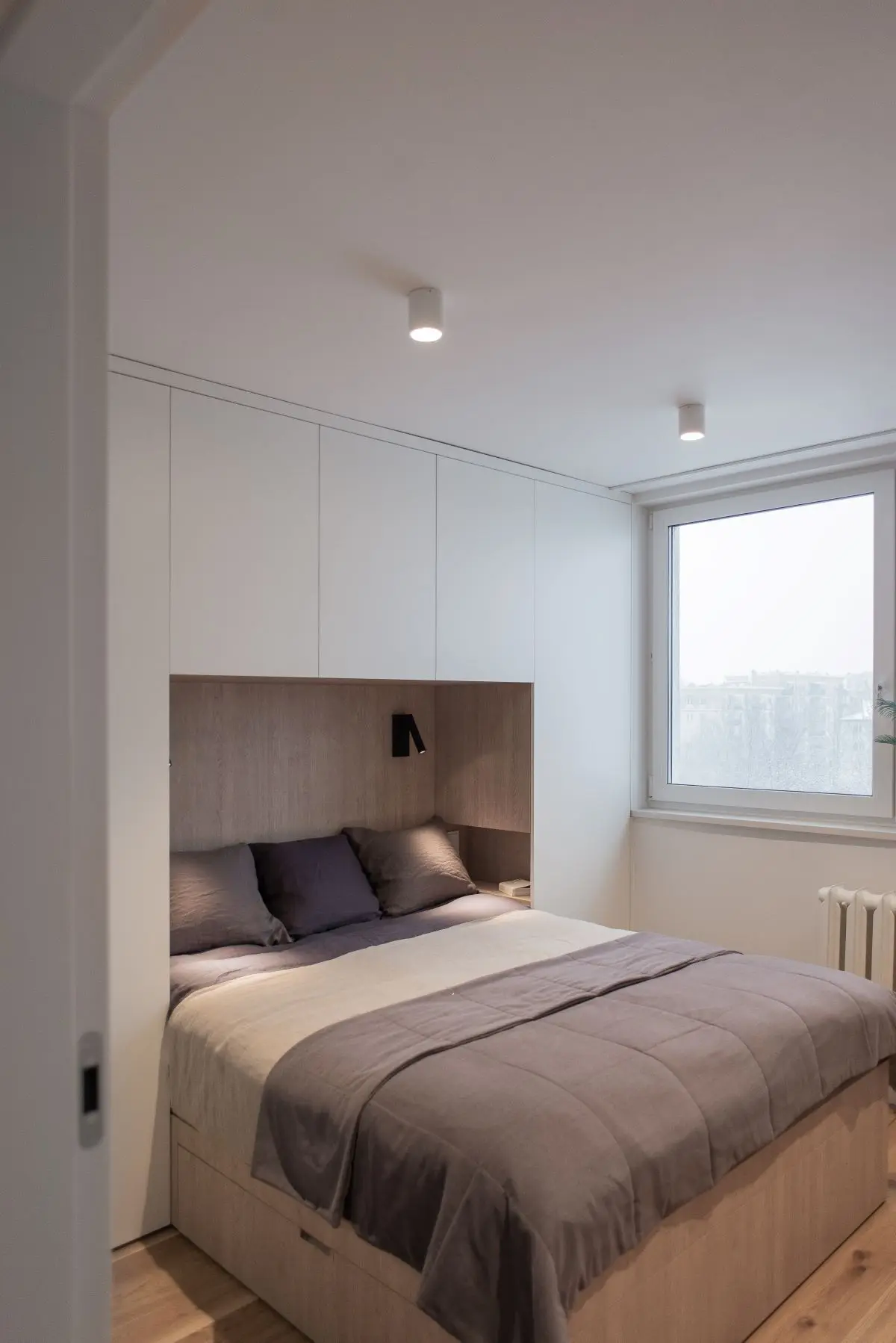Powiększona sypialnia została zdefiniowana przez jasną, wielkoformatową zabudowę stolarską na pełną wysokość i szerokość pomieszczenia, uwzględniając funkcjonalną, drewnianą wnękę na łóżko z bocznymi półkami.