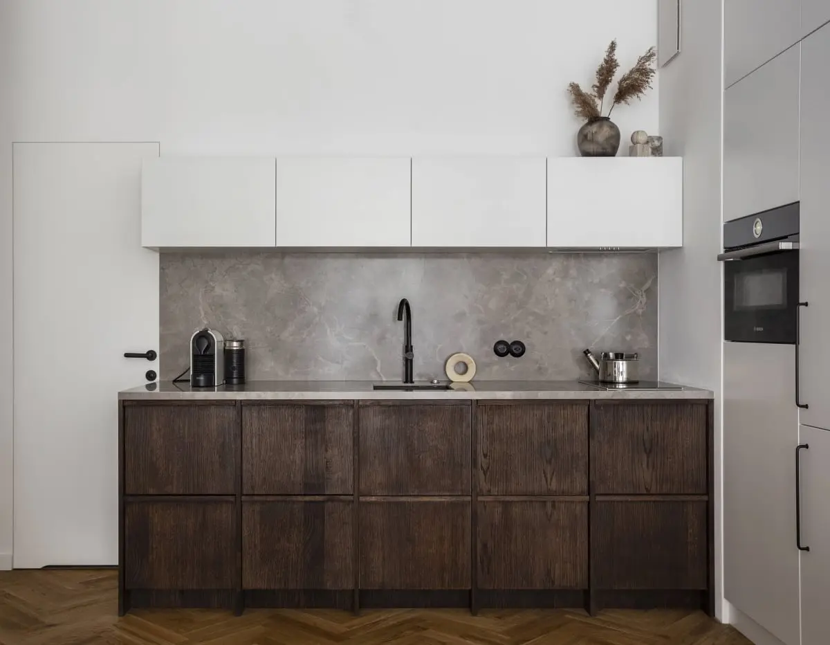 Blat kuchenny, ściana nad nim oraz umywalka łazienkowa zostały wykonane z płyt wielkoformatowych o rysunku włoskiego marmuru. Wybrane przez projektantów spieki to Fior Di Bosco z kolekcji Infinito, marki Fondovalle.