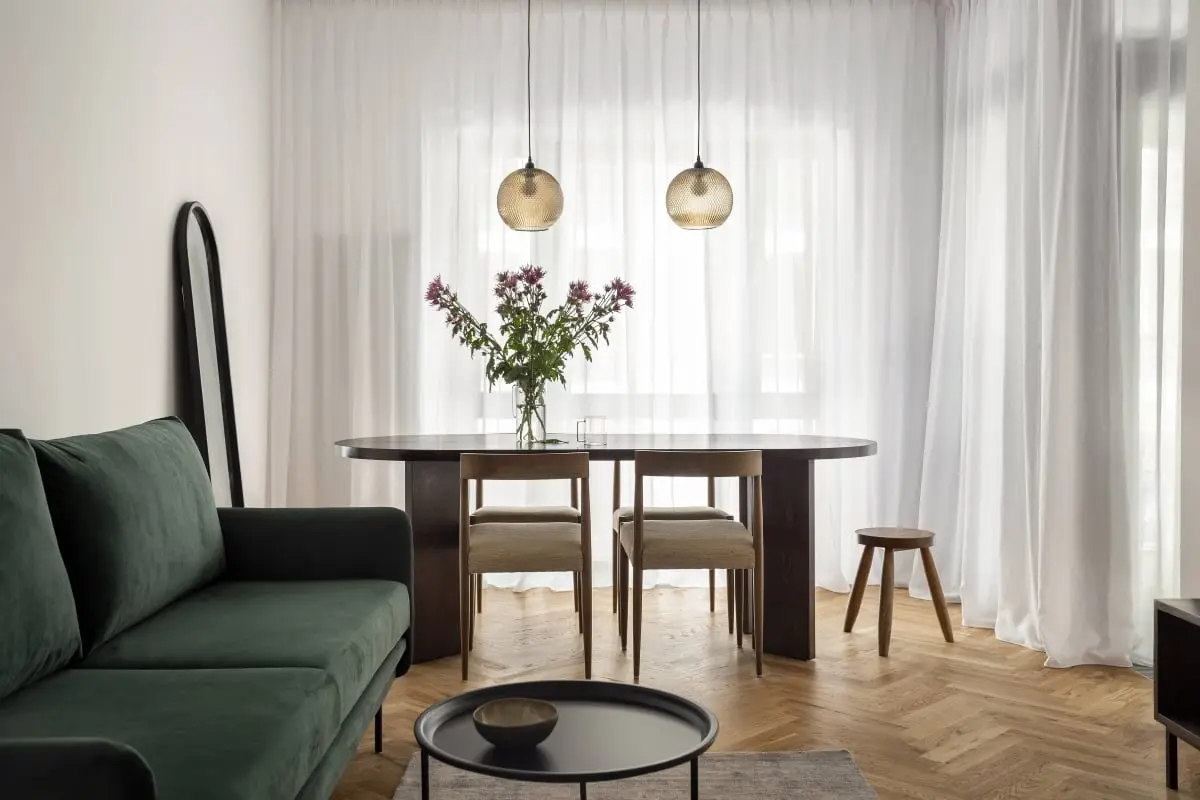 Autorzy projektu podkreślają, że zależało im na stworzeniu wnętrza przytulnego i ciepłego, a jednocześnie o minimalistycznym charakterze. Taki klimat udało się osiągnąć dzięki wykorzystaniu naturalnych materiałów, w tym dużej ilości drewna. Tłem dla aranżacji wnętrza jest biel, pokrywająca ściany i zabudowę kuchenną. Lekkie zasłony stanowią przedłużenie jasnych powierzchni, przepuszczając jednocześnie światło z dużych okien. Podłogę pokrywa parkiet w jodełkę. Takie połączenie pozwoliło na stworzenie swojego rodzaju „czystego” płótna, na którym pięknie prezentują się wyselekcjonowane elementy wyposażenia. Barwny akcent wprowadza sofa o welurowej tapicerce w kolorze morskiej zieleni. Pozostałe meble wykonane są z drewna, a projektanci zastosowali ciekawy zabieg łączenia naturalnego wybarwiania z ciemnym wenge. Dolne szafki kuchenne wykonano z wędzonego forniru dębowego, a połączenie go z szarym spiekiem o ciepłym odcieniu, nadało przestrzeni pożądanej przytulności.