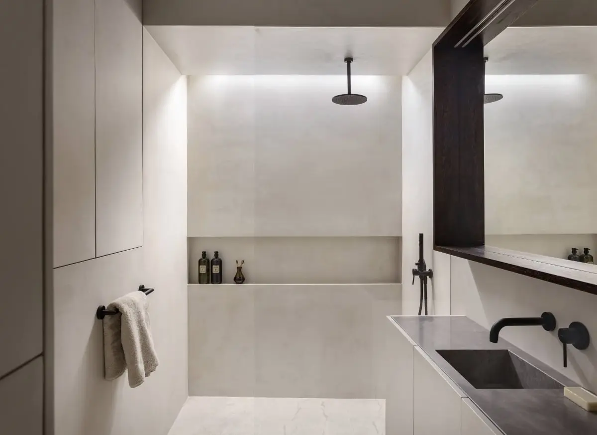 Aranżacja łazienki jest wyjątkowo elegancka, a przy tym minimalistyczna i niepozbawiona przytulności. Projektanci do pokrycia ścian i szafek, użyli piaskowego mikrocementu w kolorze złamanej bieli. Natomiast podłogę pokrywają płytki o teksturze kamienia, których odcień został idealnie dobrany do ścian. Przestronny prysznic typu walk-in, został wyposażony w sufitową głowice prysznica. Ciekawym rozwiązaniem dopełniającym minimalistyczny look łazienki jest półka na kosmetyki w formie wnęki. Umywalka oraz blat, znajdujące się na szafce, zostały wykonane ze spieku, wykorzystanego również w kuchni. Lustro umieszczone w głębokiej, drewnianej ramie, również nawiązuje do materiałów wykorzystanych w pozostałych pomieszczeniach mieszkania. Uzupełnieniem aranżacji salonu kąpielowego jest czarna, matowa armatura.