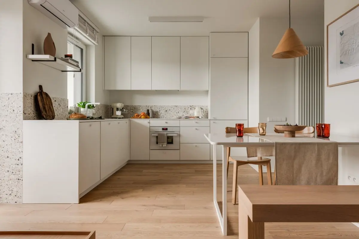 Apartament jest podzielony na dwie strefy: dzienną i nocną. Jego sercem jest salon połączony z przestronną kuchnią. Zastosowane białe minimalistyczne fronty doskonale rezonują z drewnianą podłogą i akcentami zaczerpniętymi z japońskiego designu. Ławka zamiast krzeseł wprowadza pożądany balans i sprawia, że przestrzeń jest jeszcze bardziej ,,czysta”.