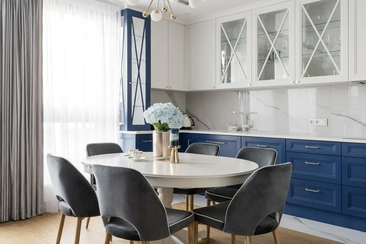W kuchni architekci zastosowali jasny podział: górne szafki i witryny są w bieli, natomiast dolne wykończono w kolorze przewodnim projektu. Z matem zastosowanym na płytkach podłogowych i frontach kontrastuje wysokopołyskowa ściana nad blatem, której szyku zadaje rysunek marmuru.