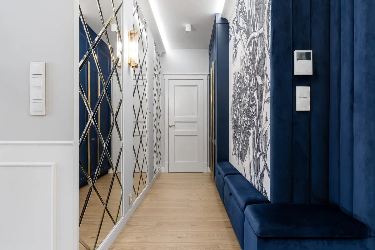 Wnętrze zostało dopieszczone przez nas do ostatniego szczegółu, było wykonywane w projekcie z nadzorem i naszymi ekipami – POD KLUCZ. Zajęliśmy się zarówno wyrysowaniem funkcjonalności każdego mebla stolarskiego, jak i dopieszczeniem takich detali jak fazowane, kryształowe lustra, czy sposób montażu domofonu na siedzisku tapicerowanym.