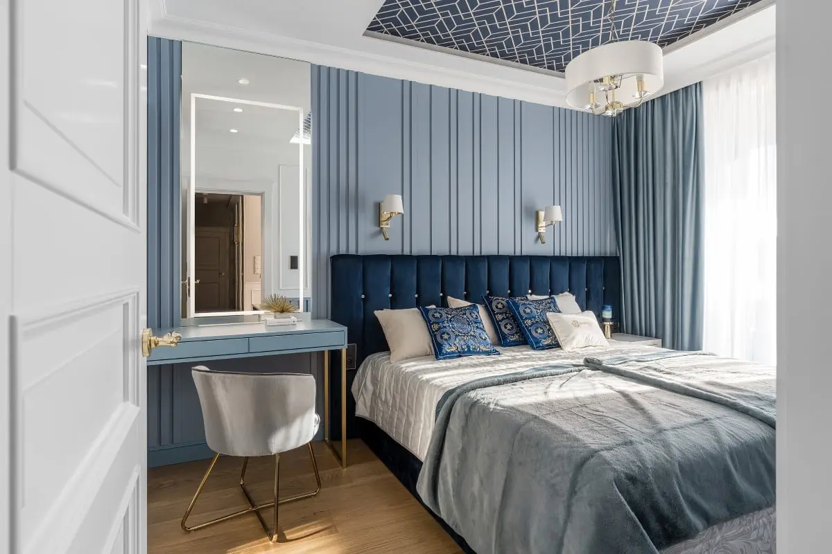 Azylem właścicieli mieszkania jest sypialnia w królewskim stylu. Jej centrum stanowi łoże z dużym tapicerowanym wezgłowiem. W tak eleganckim wnętrzu nie mogło zabraknąć toaletki, którą zintegrowano z zabudową meblową pełniącą rolę garderoby. Liczne lustra sprawiają, że pomieszczenie wygląda na większe i bardziej przestronne. Ciekawym zabiegiem dekoracyjnym jest zastosowana na suficie tapeta w geometryczne wzory.