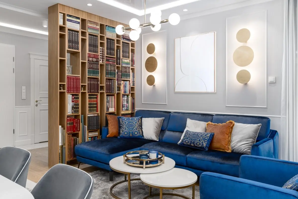 Sercem mieszkania jest otwarta strefa dzienna, oddzielona od przedpokoju dębowym regałem na książki, skrojonym na miarę tego wnętrza. Mocnymi akcentami aranżacji jest granatowy narożnik, fotel oraz zabudowa kuchenna. Reszta jest raczej stonowana. Dzięki zastosowaniu napinanego białego sufitu w połysku, salon zyskuje na przestronności.