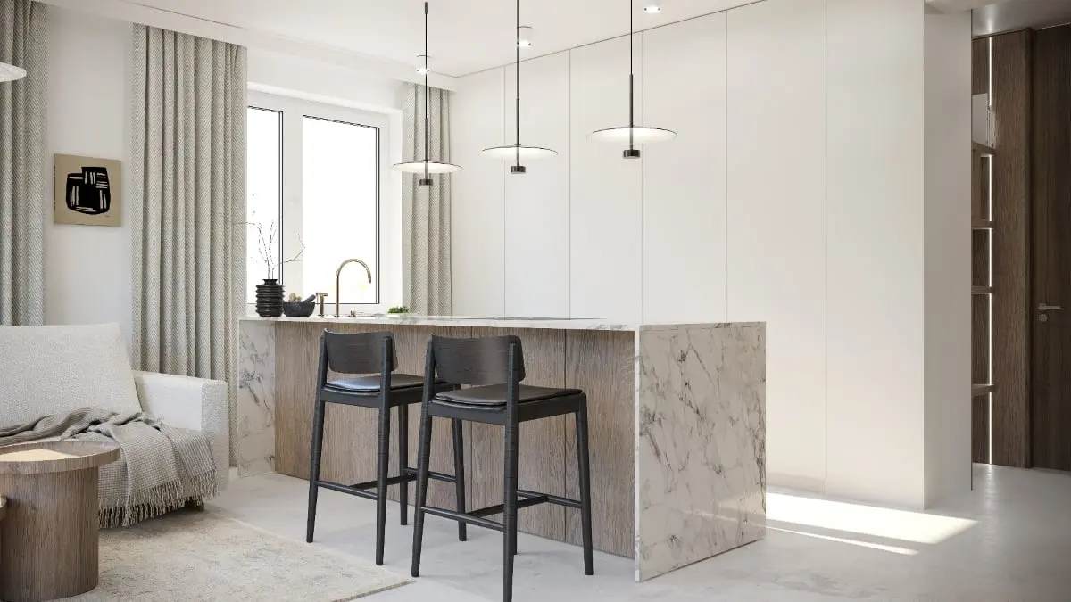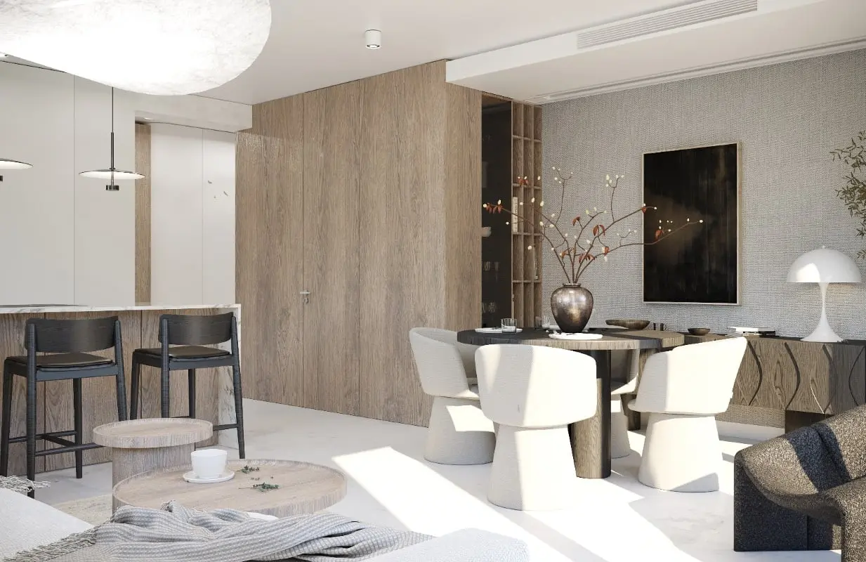 Apartament składa się z części dziennej, sypialni, łazienki oraz mini siłowni. Każde z tych pomieszczeń zostało zaaranżowane w sposób niezwykle spójny, tworząc harmonijną całość. Inspiracją dla koncepcji wnętrza był styl japandi oraz new nordic, które wprowadzają do przestrzeni minimalistyczną elegancję i funkcjonalność. Tym samym architektki śmiało przełamały schemat, według którego styl męski równa się ciemnym wnętrzom w klimacie industrialnym. Podstawą dla wrocławskiego apartamentu są tekstury drewna oraz kamienia, połączone z tkaninami o wyraźnym splocie. Niezwykłą uwagę poświęcono także selekcji wyposażenia, które obejmuje designerskie meble oraz starannie dobrane oświetlenie, tworzące spójną i stylową przestrzeń.