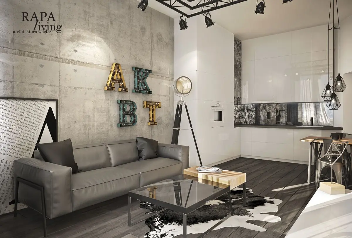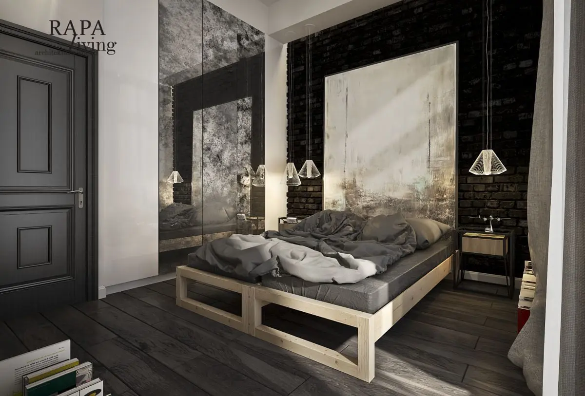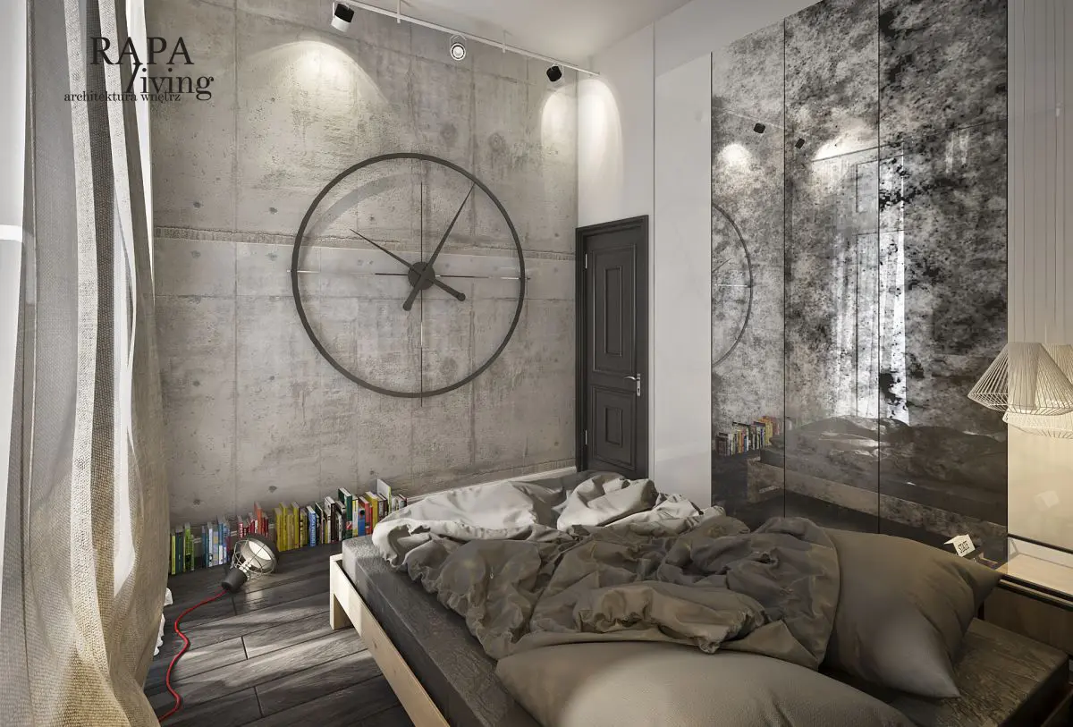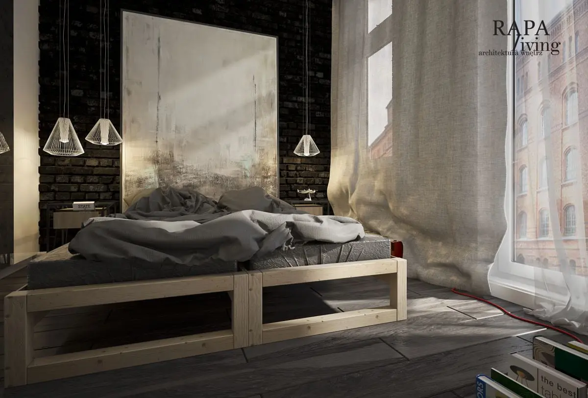 W projekcie wykorzystano nietypowe rozwiązania, jak na przykład lampę wzorowaną na technicznym, scenicznym oświetleniu tworząca wrażenie teatralnego oświetlenia, blaszane krzesła, szafy na zamówienie, łóżko z palet i postarzane dodatki. Wnętrze to połączenie surowej stali, (krzesła, dodatki w meblach) cegły rozbiórkowej nadającej charakteru, starego betonu określającego pewną industrialną nutę, drewna nadającego ciepła, postarzanych luster dających wrażenie zużycia. Biel w lakierowanych na połysk meblach to swego rodzaju symbol nowoczesności.