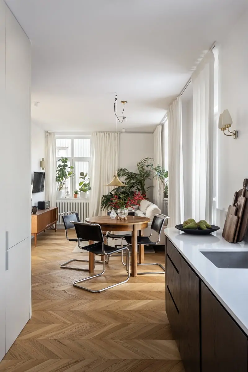 Wygospodarowanie z przestrzeni mieszkania zaoblonej kostki, pozwoliło na zorganizowanie w niej łazienki, ale także ukrycie spiżarni oraz wysokiej zabudowy kuchennej. W zamyśle Architektek, aneks kuchenny będący integralną częścią salonu, miał przypominać przedwojenną komodę w nowoczesnym wydaniu. Stąd bardzo ciekawa, organiczna forma szafek dolnych w głębokim odcieniu drewna, które zostało połączone z białym blatem. Dębowy stół jadalniany dekorują znalezione na strychu kryształy. Mebel wyeksponowany na osi wejścia, połączył kuchnię ze strefą wypoczynkową.