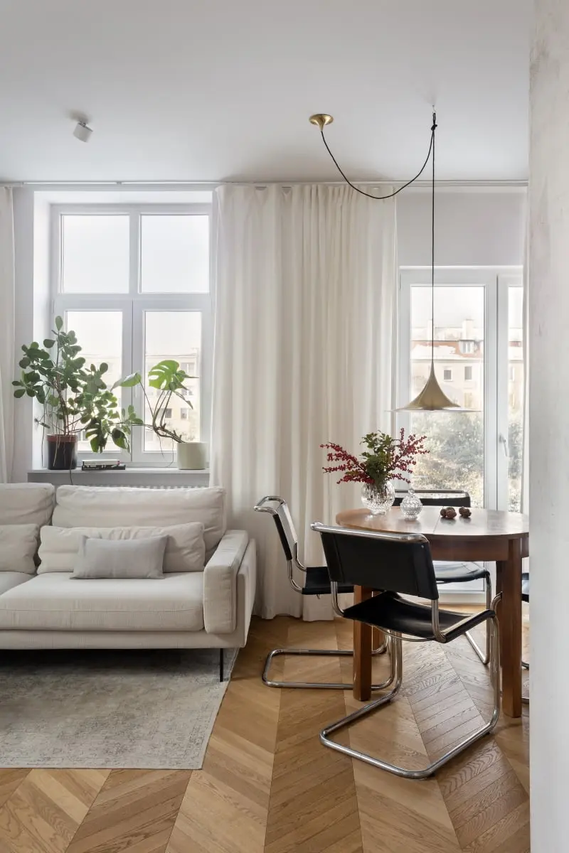 Ceglana ściana z łukiem, pozostawiona z oryginalnego wnętrza, naturalnie rozdzieliła strefę dzienną i sypialnianą. Natomiast problematyczną lokalizację komina pośrodku łazienki, architektki przekuły w atut i wykorzystały element do wygospodarowania strefy kąpielowej. Prostą stylistykę i subtelne barwy aranżacji, wzbogacają motywy vintage, które podkreślają przedwojenny charakter architektury. Beż i biel przeplata się z wyrazistą bejcą drewna, czarną skórą oraz złotymi i chromowanymi akcentami. Minimalistyczna architektura wyrażona w wysokiej jakości materiałach stanowi idealne tło dla bauhausowych krzeseł Wassily, projektu Marcela Breuera oraz kultowej lampy Semi od Gubi. We wnętrzu wyeksponowano, również kilka innych perełek znalezionych na strychu – min. obraz oraz kinkiety w kuchni. Te dodatki mają szczególną wartość dla Właścicieli, ponieważ są pamiątką po wcześniejszych mieszkańcach budynku.