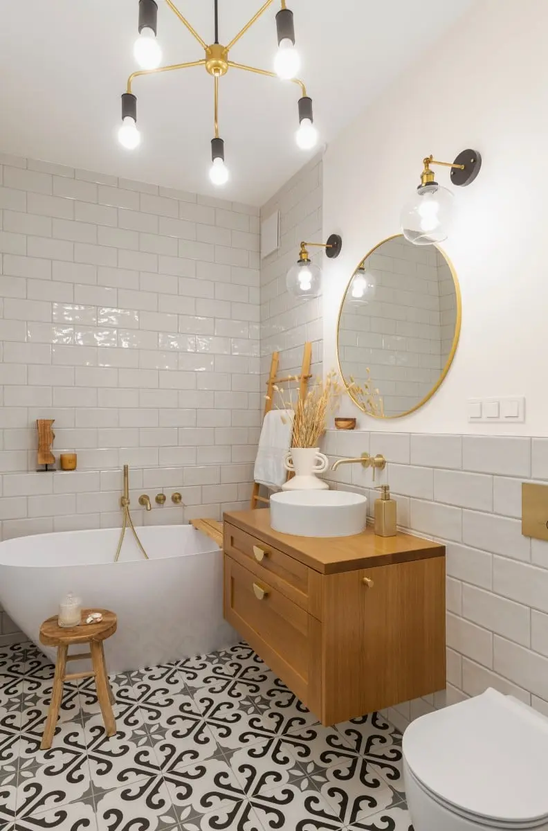 W mieszkaniu znajdują się dwie łazienki. Jedna pełni rolę salonu kąpielowego, druga umożliwia szybki prysznic. Oba wnętrza są w zupełnie różnych klimatach. W pokoju kąpielowym tradycja przeplata się ze stylem boho. Podstawę aranżacji tworzą kafle z wyraźną nierównomierną strukturą. Przeciwwagą dla cegiełek, które znamy z pieców kaflowych obecnych niegdyś w domach naszych babć, jest misternie ułożony wzór na posadzce. Całość dopełnia złoto oraz drewno.