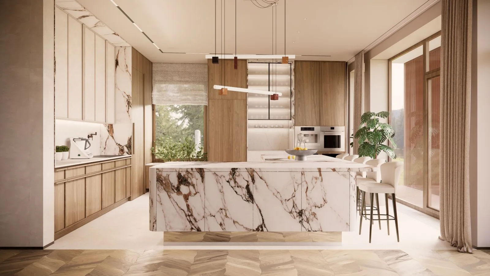 W kuchni dominuje marmur z szarym żyłkowaniem, a złota armatura oraz zlew to Reginox. Minimalistyczne złote uchwyty zdobią białe proste meble kuchenne wykonane na zamówienie. Lodówka znajduje się w zabudowie meblowej.