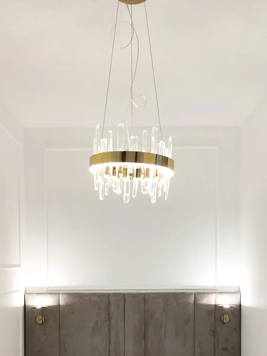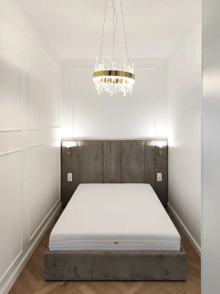 W sypialni w stylu nowojorskim centralnym punktem jest oczywiście łóżko z eleganckim pikowanych wezgłowiem z weluru. Złote kinkiety oraz żyrandol dodają blasku.