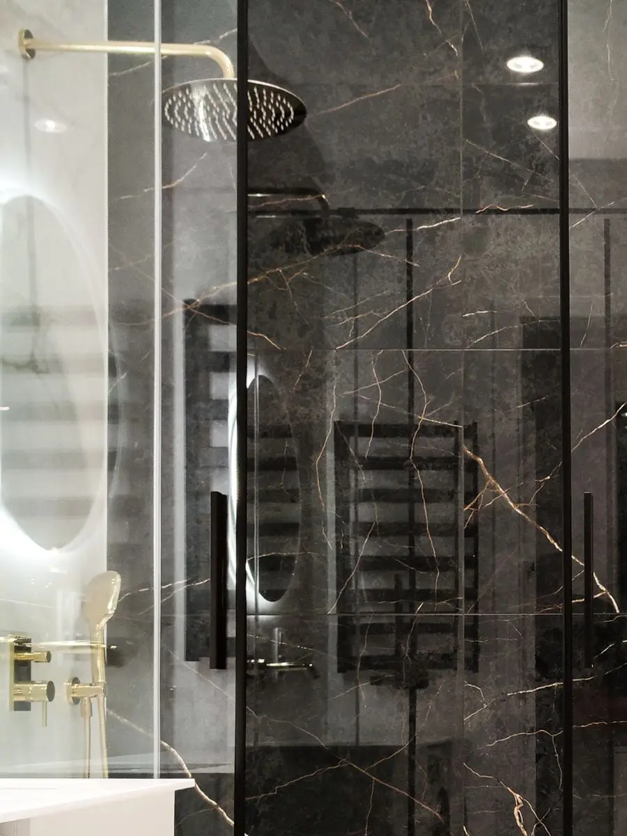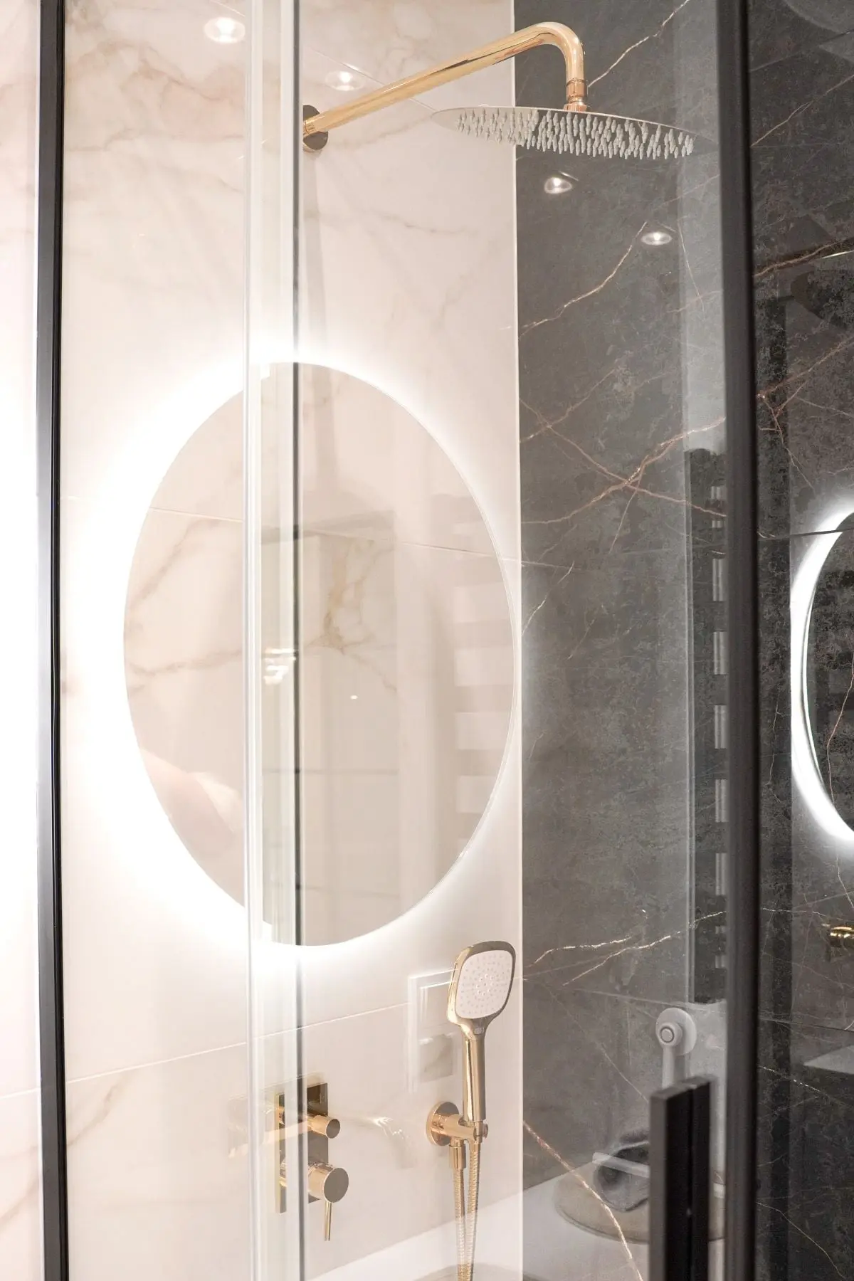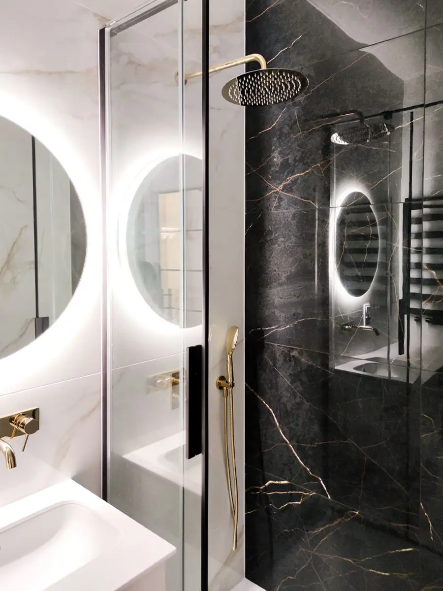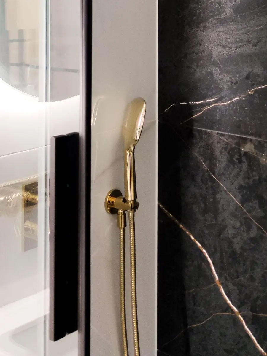 W łazience do wyznaczenia stref wybrano dwa rodzaje marmuru: biały w strefie umywalkowej a w strefie prysznicowej czarny. Szlachetność i styl wnętrza podkreśla złota armatura Hushlab z kolekcji Lukka.