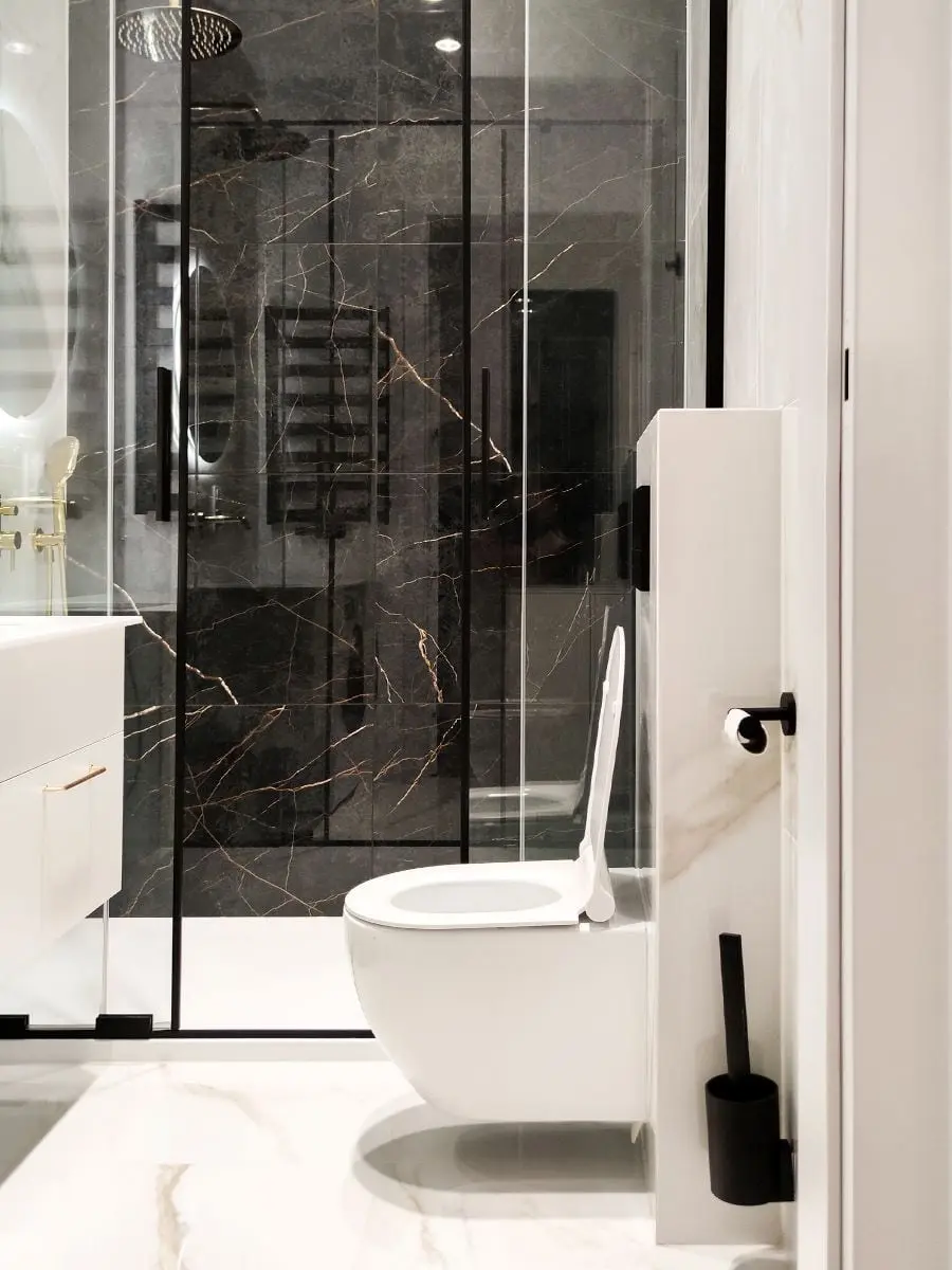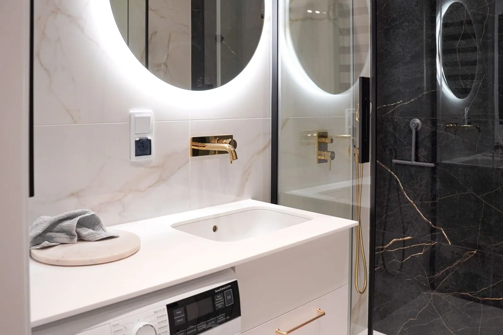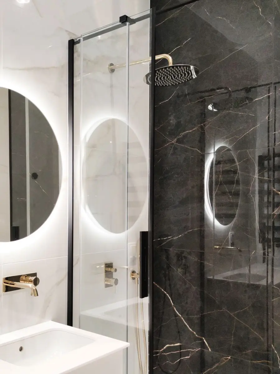 W łazience do wyznaczenia stref wybrano dwa rodzaje marmuru: biały w strefie umywalkowej a w strefie prysznicowej czarny. Szlachetność i styl wnętrza podkreśla złota armatura Hushlab z kolekcji Lukka.