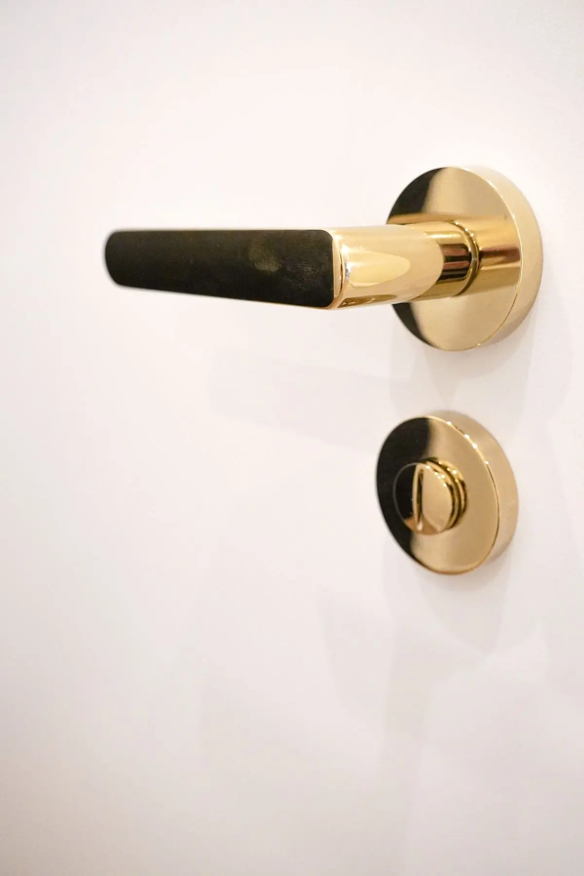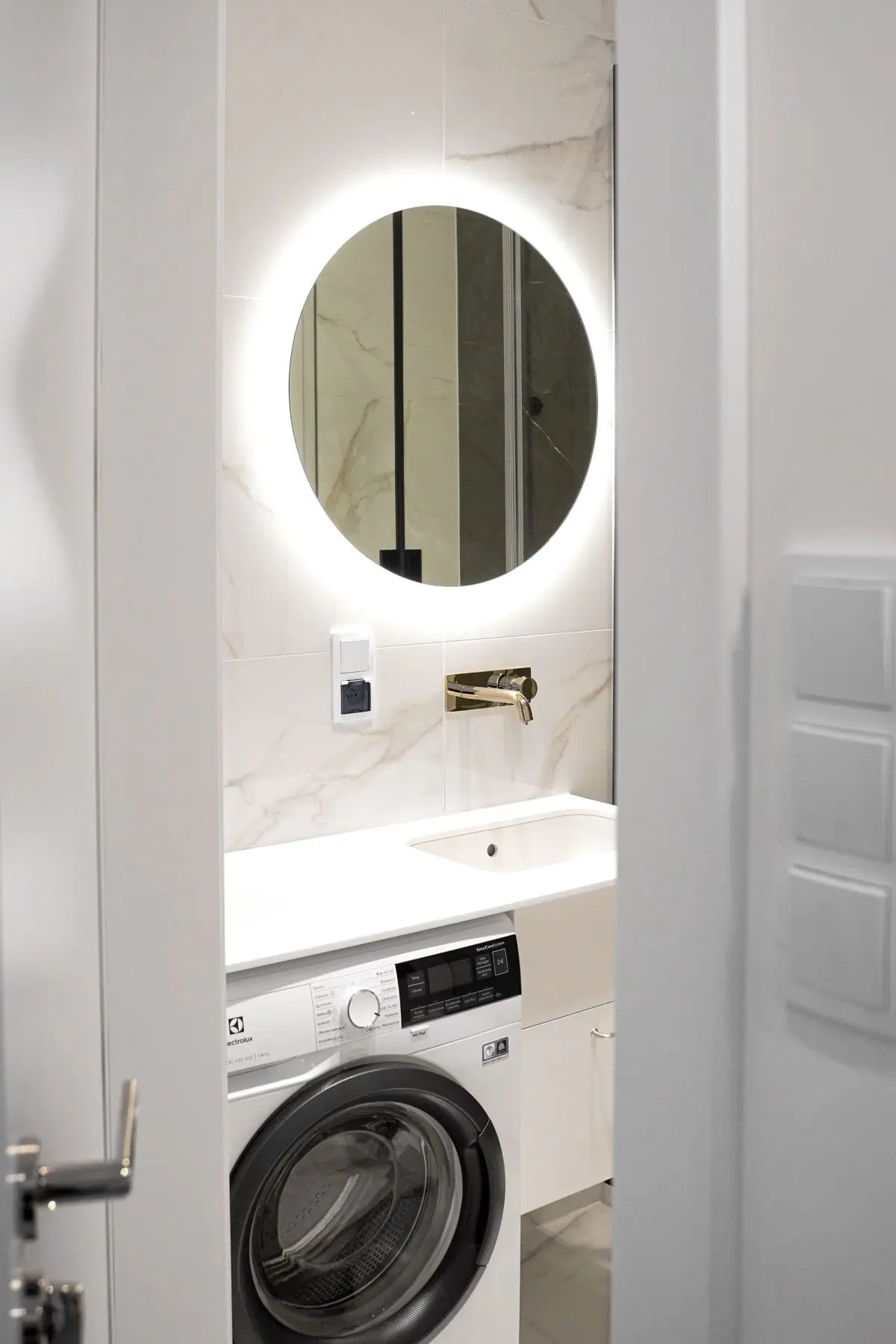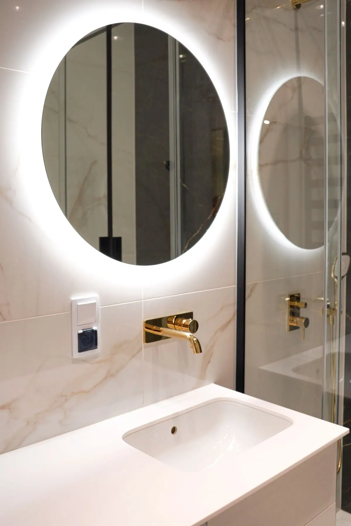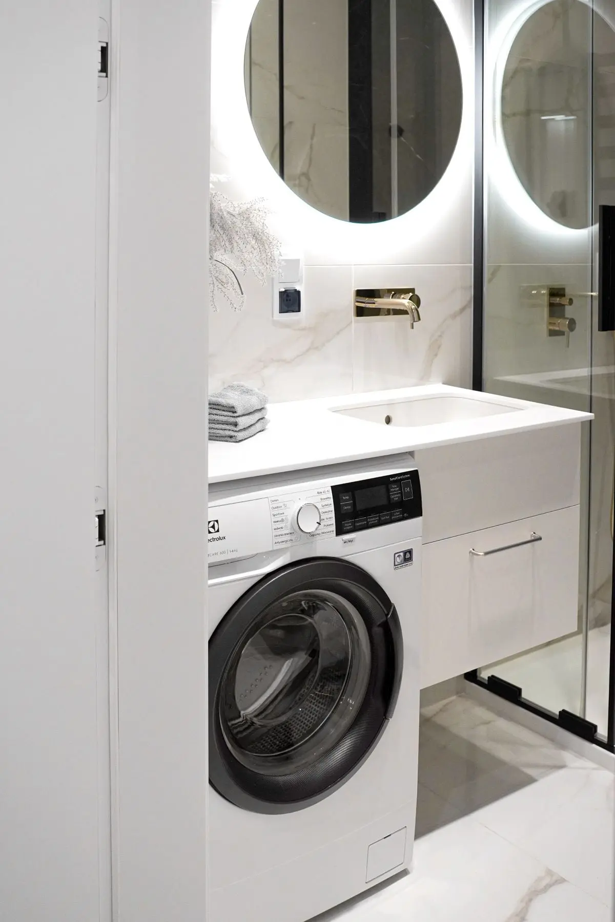 W łazience do wyznaczenia stref wybrano dwa rodzaje marmuru: biały w strefie umywalkowej a w strefie prysznicowej czarny. Szlachetność i styl wnętrza podkreśla złota armatura Hushlab z kolekcji Lukka.