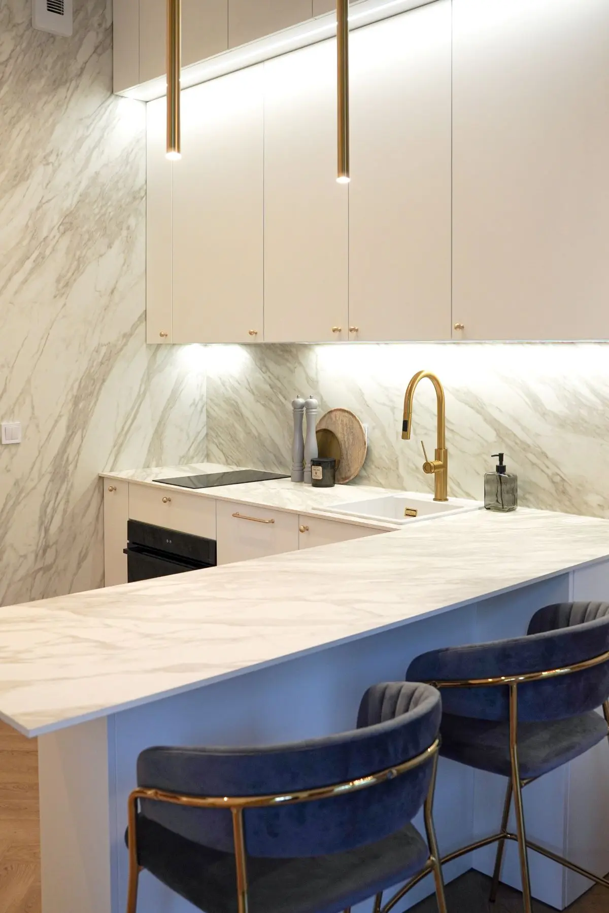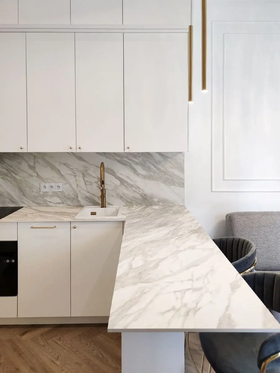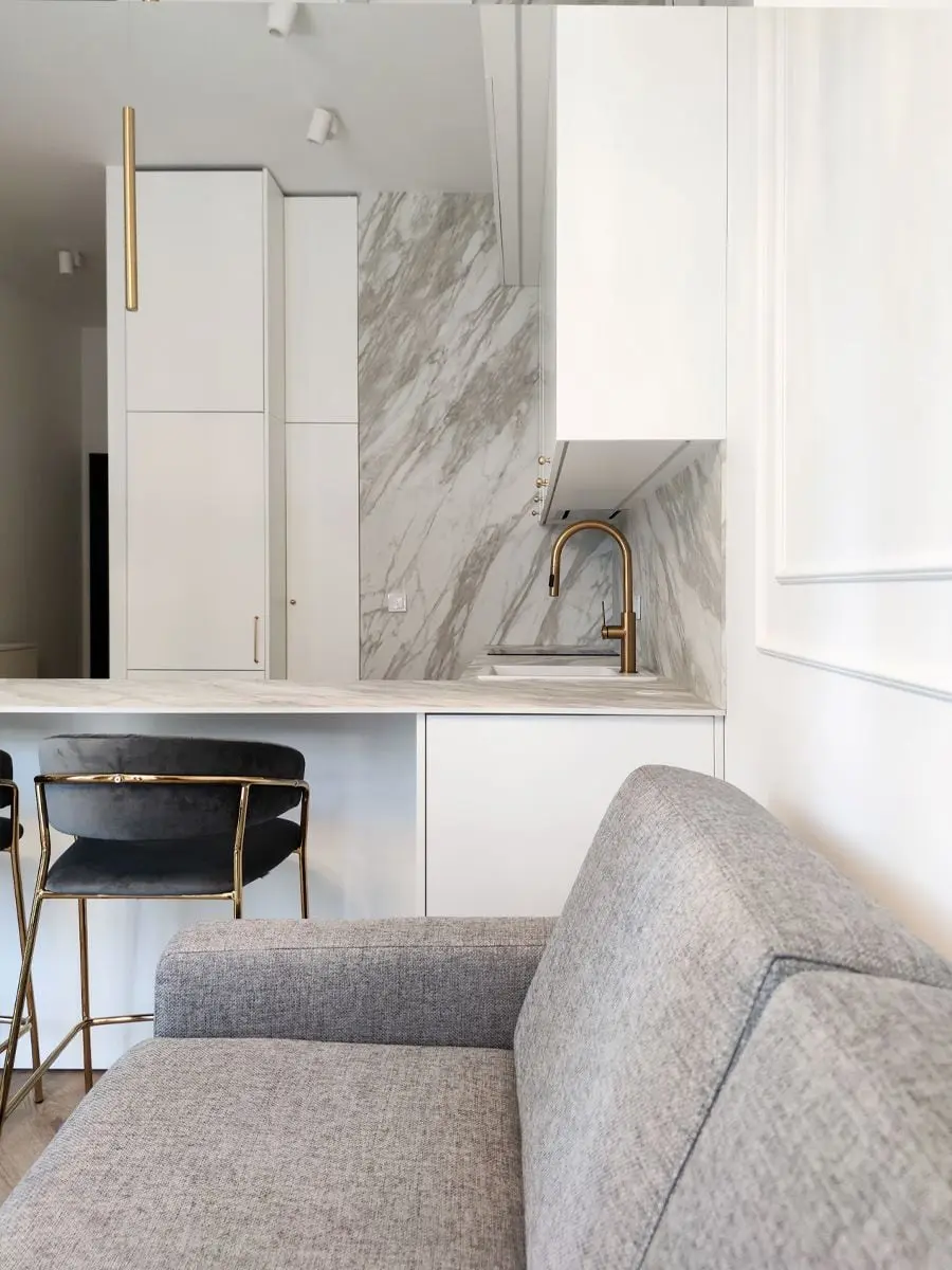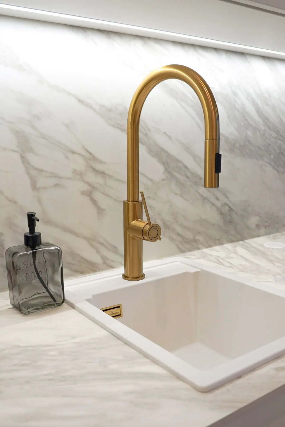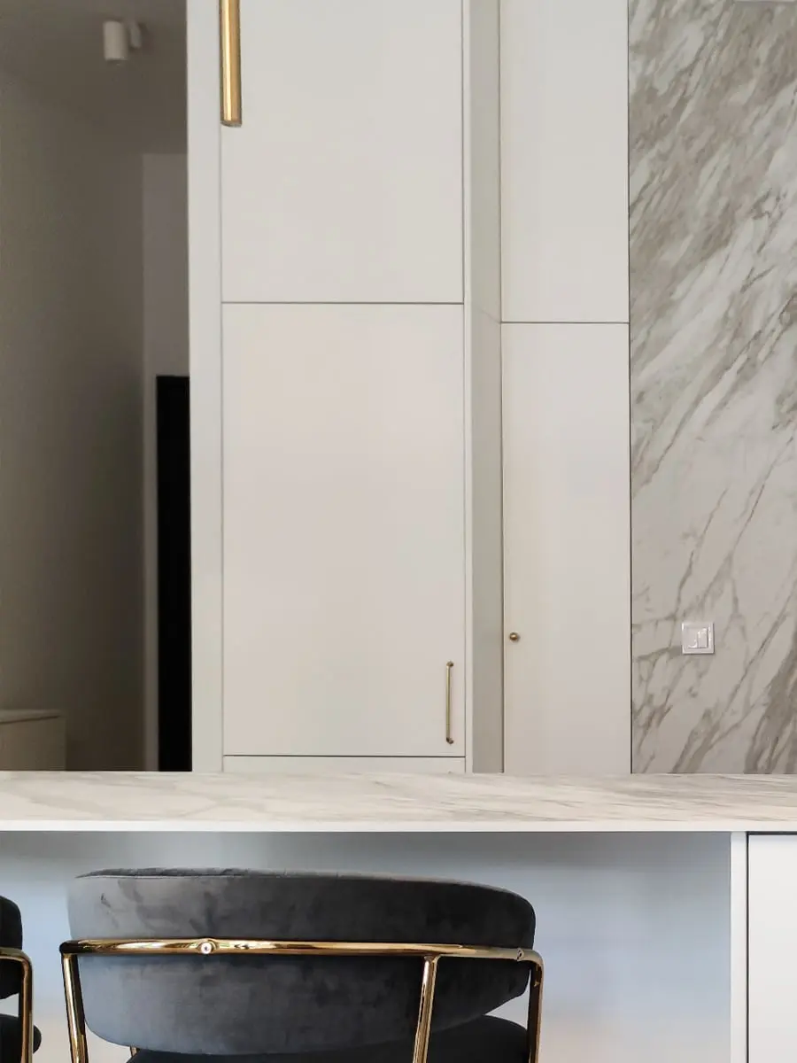 W kuchni dominuje marmur z szarym żyłkowaniem, a złota armatura oraz zlew to Reginox. Minimalistyczne złote uchwyty zdobią białe proste meble kuchenne wykonane na zamówienie. Lodówka znajduje się w zabudowie meblowej.