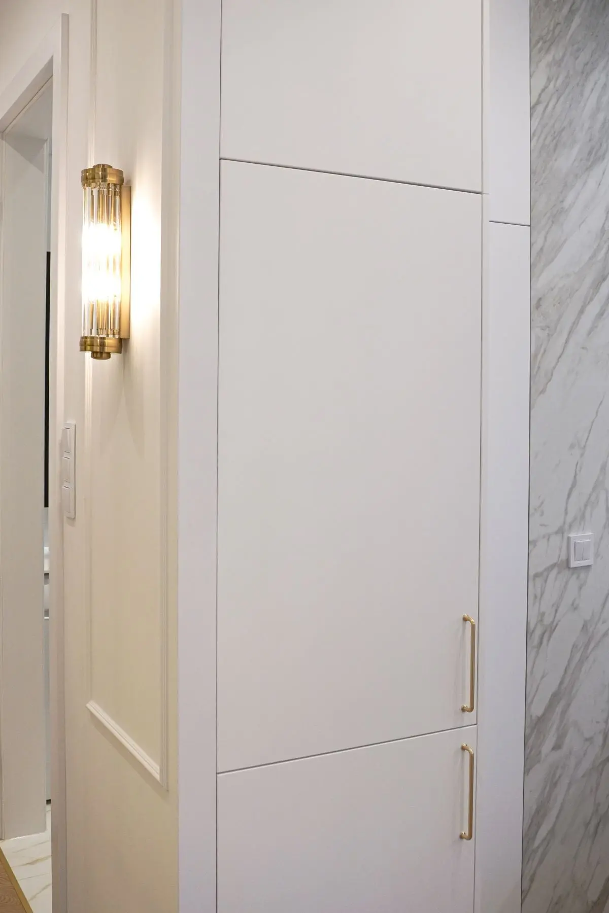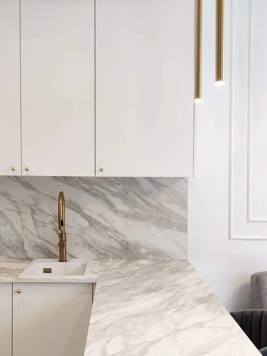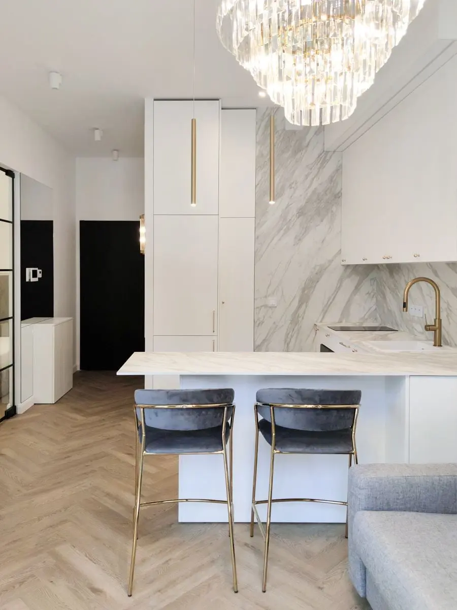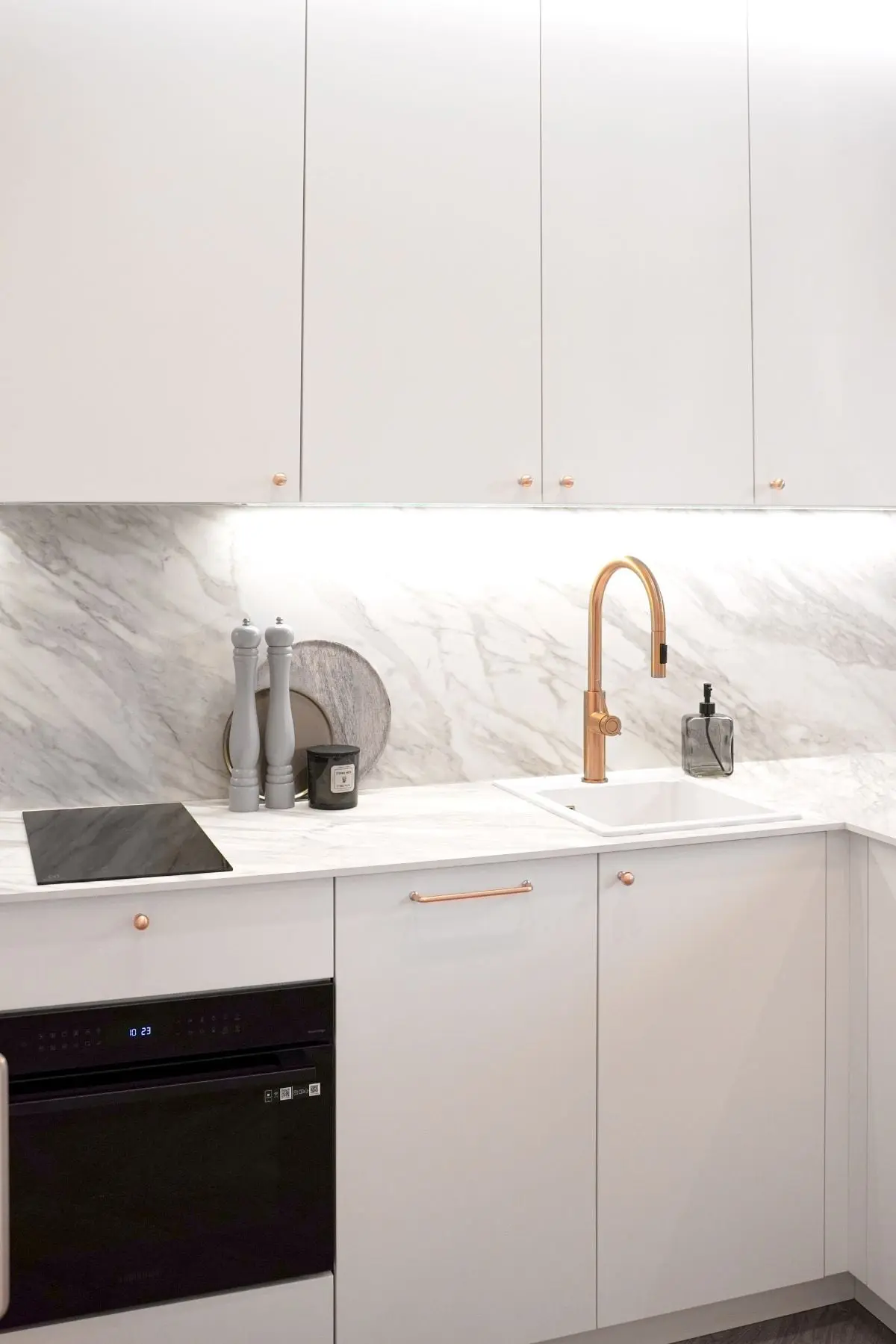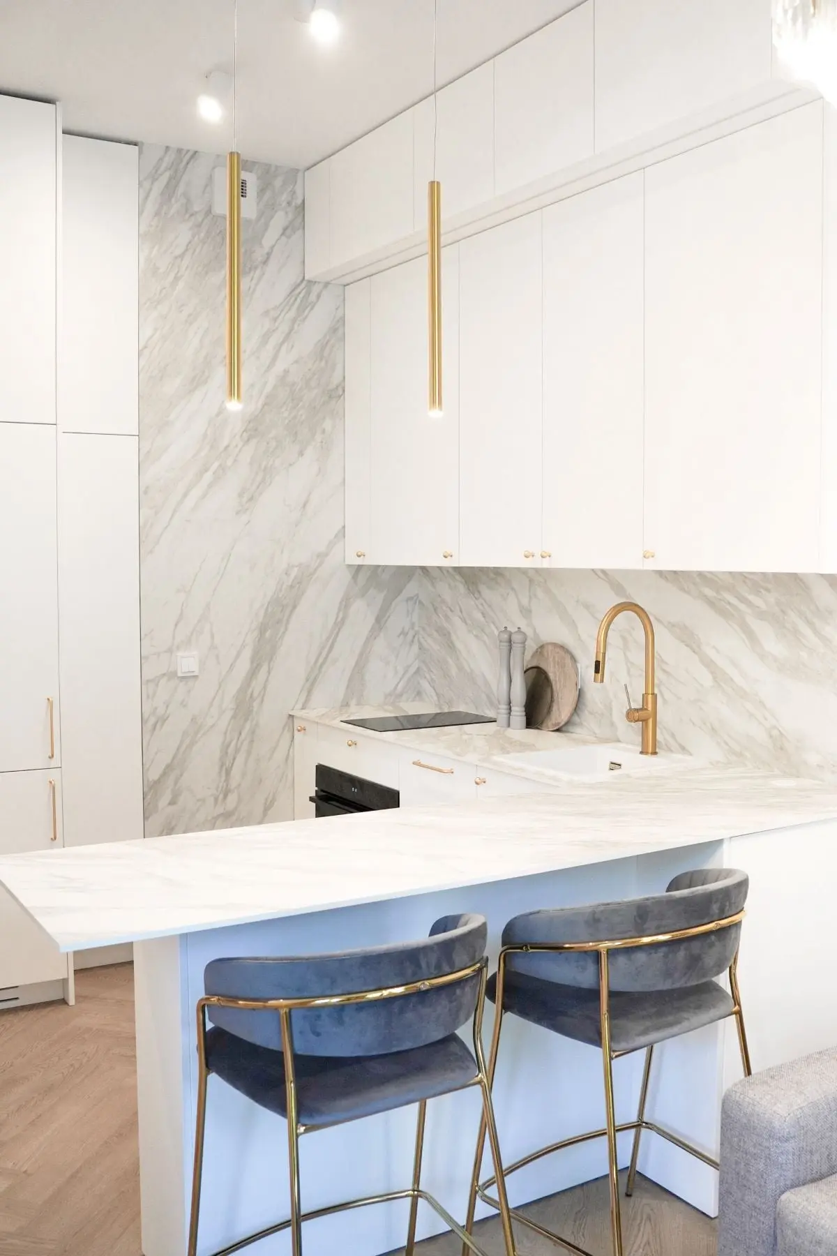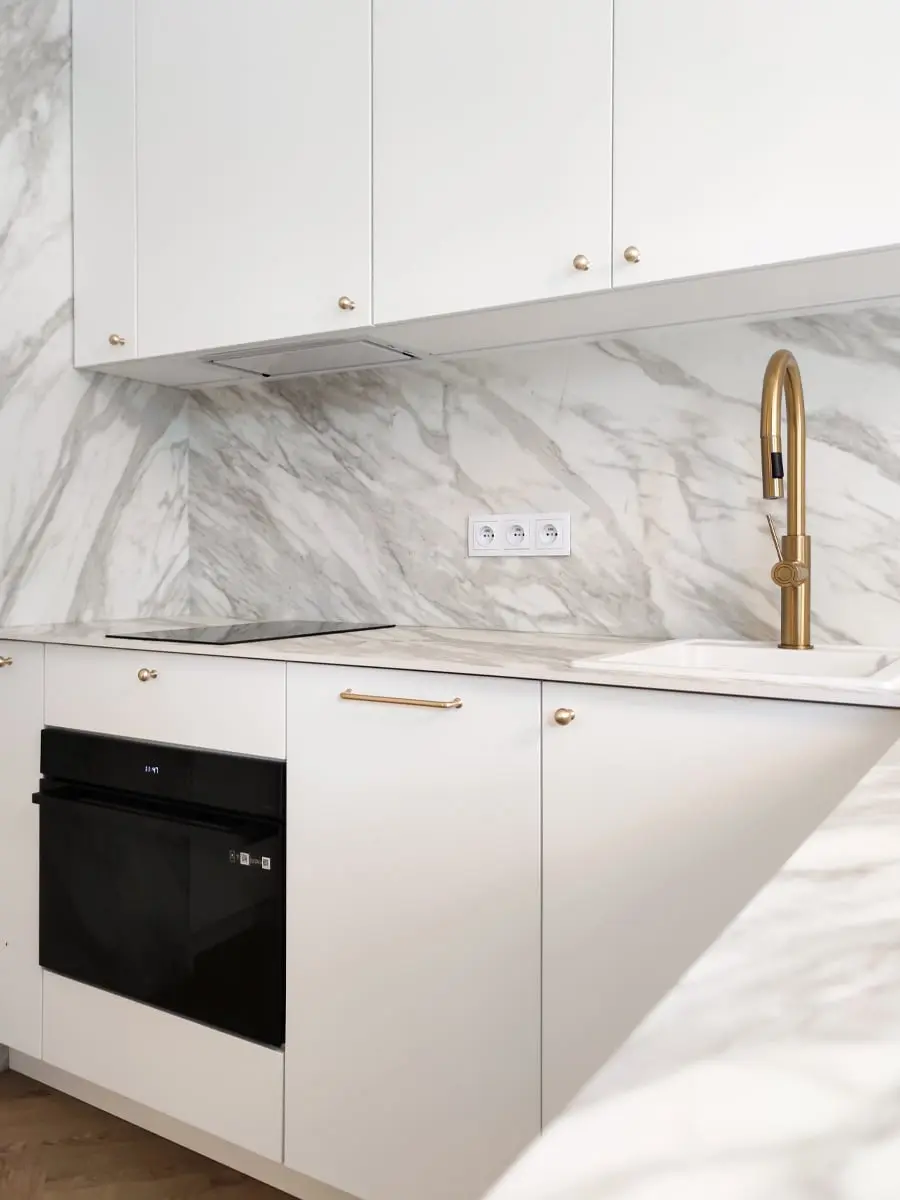 W kuchni dominuje marmur z szarym żyłkowaniem, a złota armatura oraz zlew to Reginox. Minimalistyczne złote uchwyty zdobią białe proste meble kuchenne wykonane na zamówienie. Lodówka znajduje się w zabudowie meblowej.
