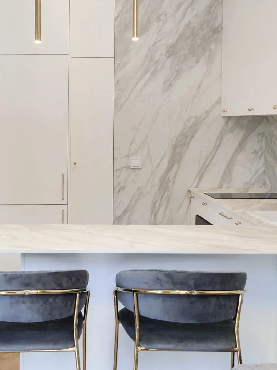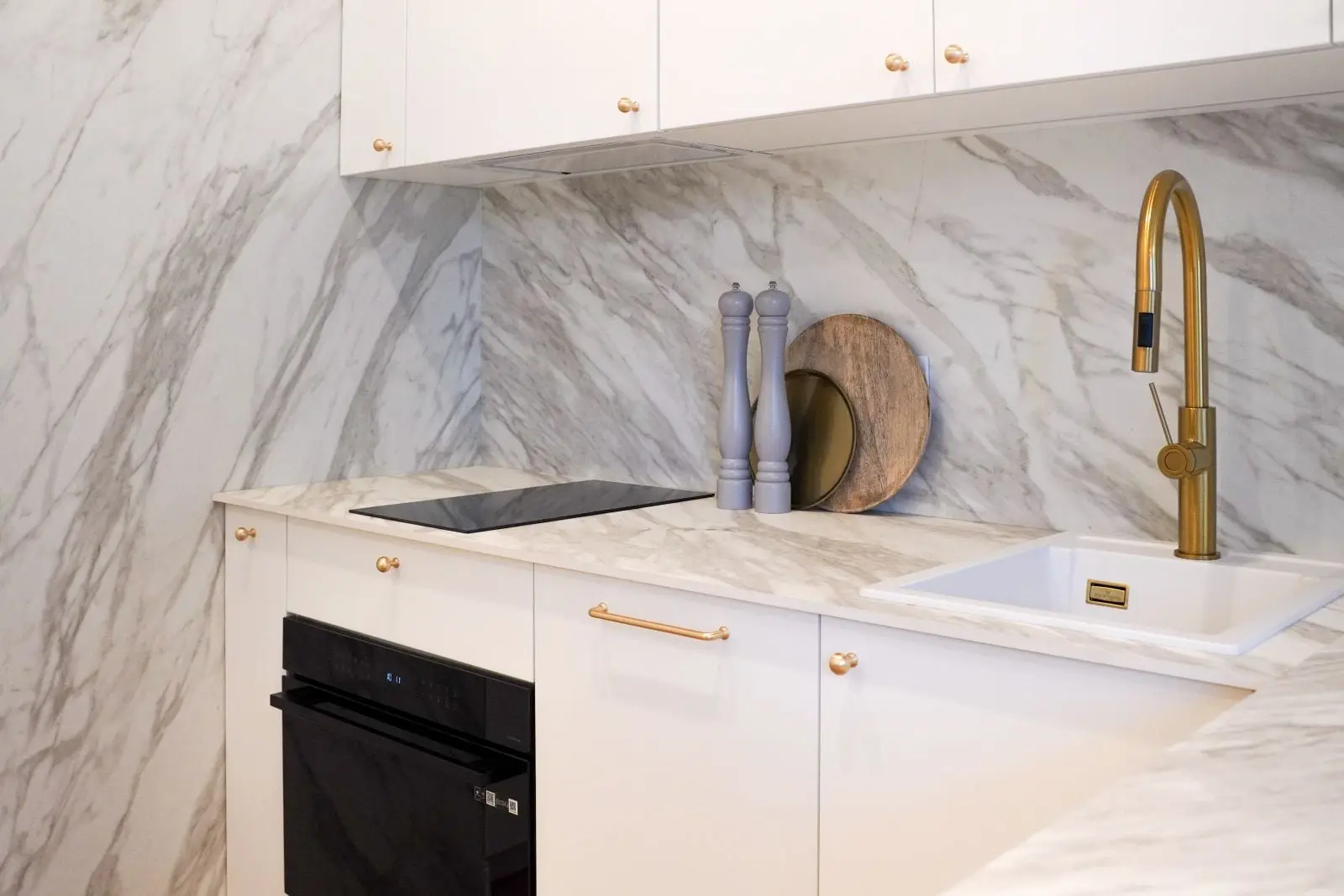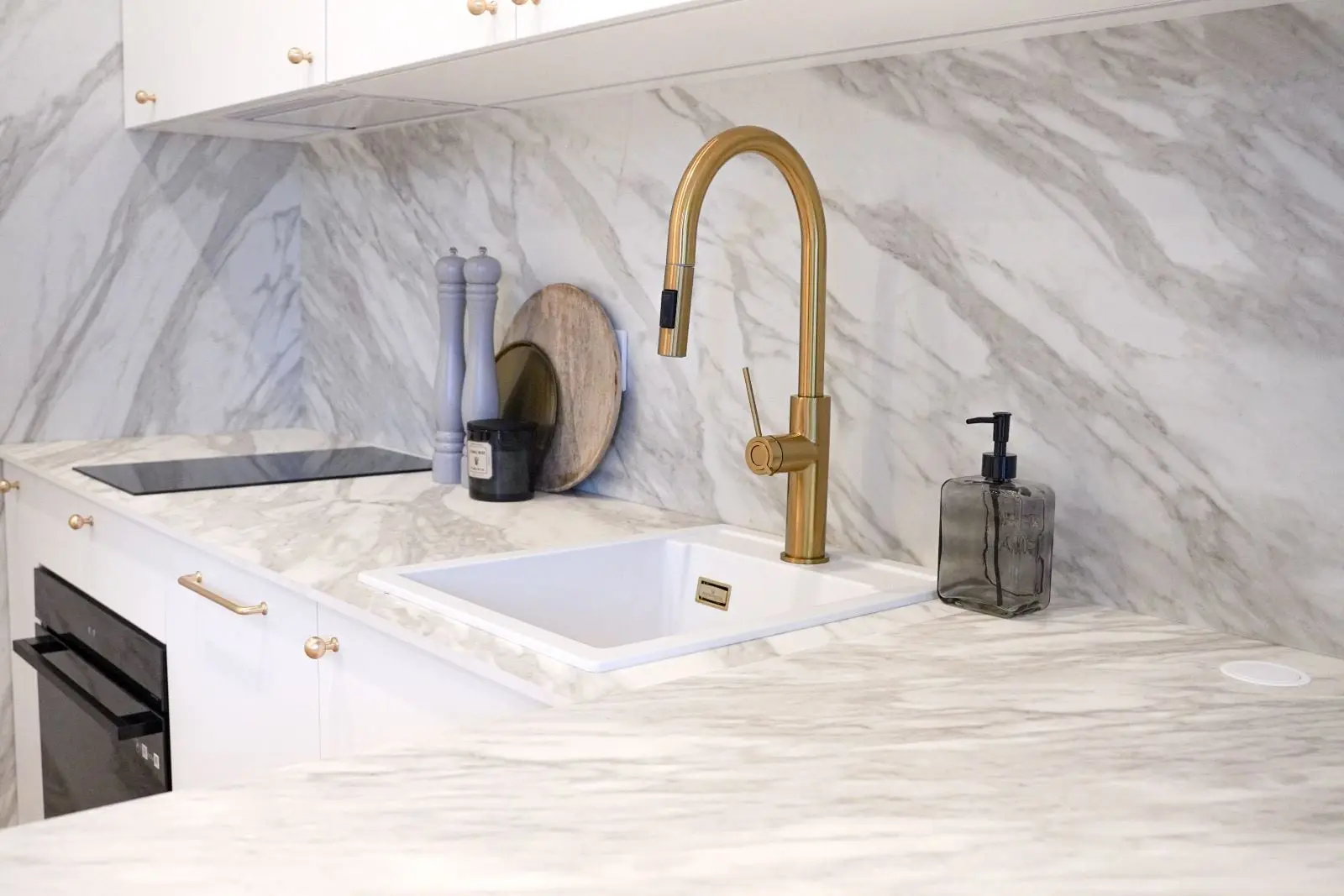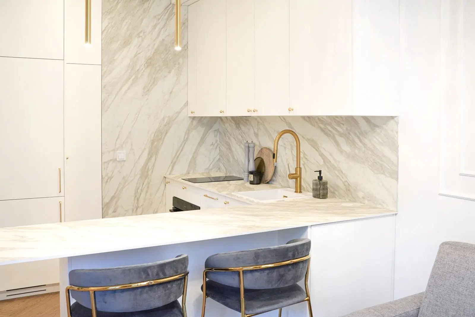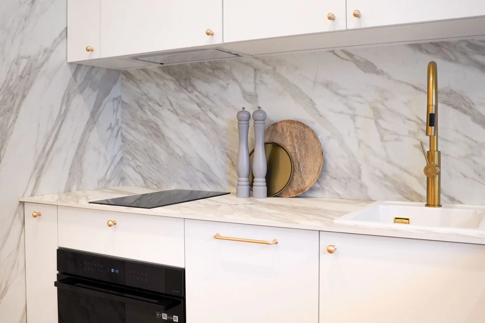 W kuchni dominuje marmur z szarym żyłkowaniem, a złota armatura oraz zlew to Reginox. Minimalistyczne złote uchwyty zdobią białe proste meble kuchenne wykonane na zamówienie. Lodówka znajduje się w zabudowie meblowej.
