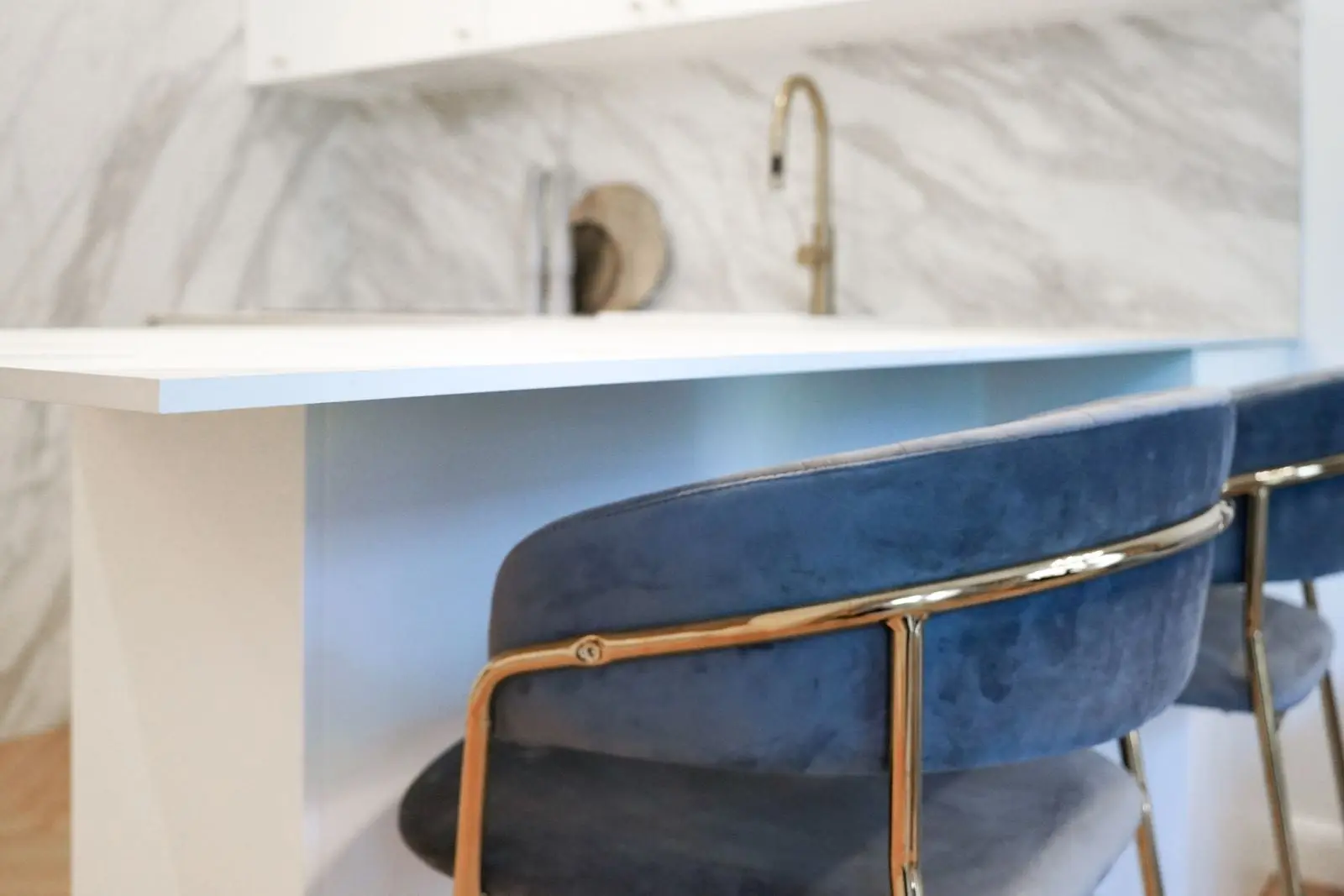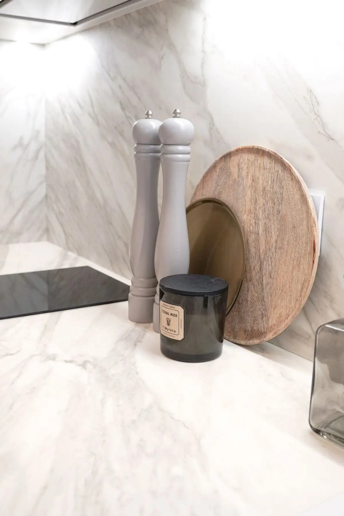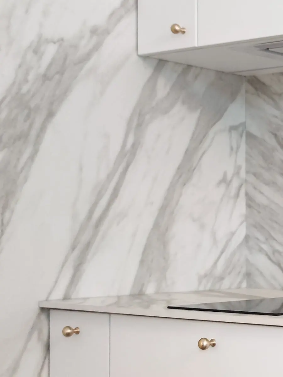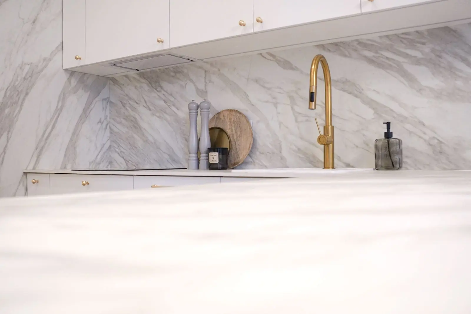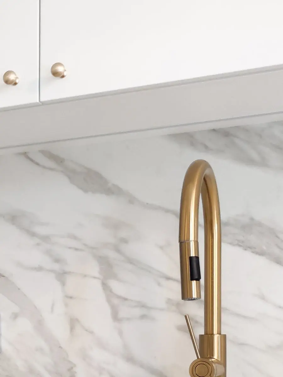 W kuchni dominuje marmur z szarym żyłkowaniem, a złota armatura oraz zlew to Reginox. Minimalistyczne złote uchwyty zdobią białe proste meble kuchenne wykonane na zamówienie. Lodówka znajduje się w zabudowie meblowej.