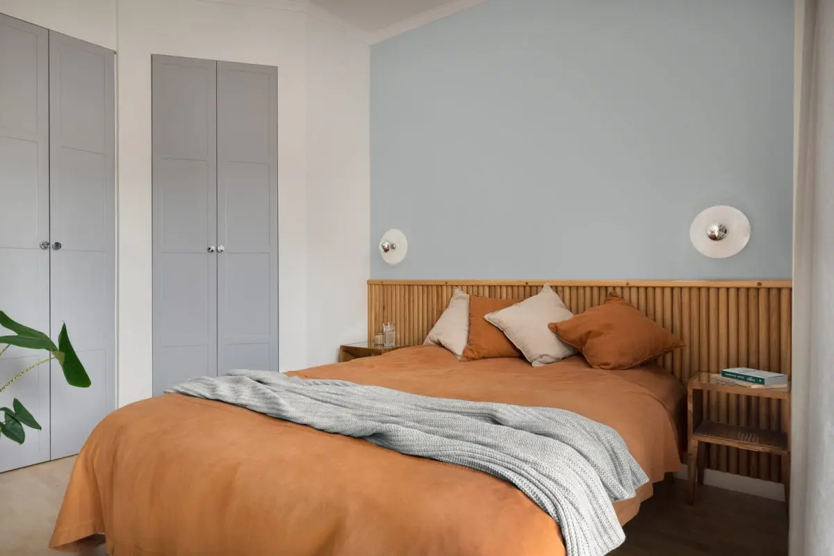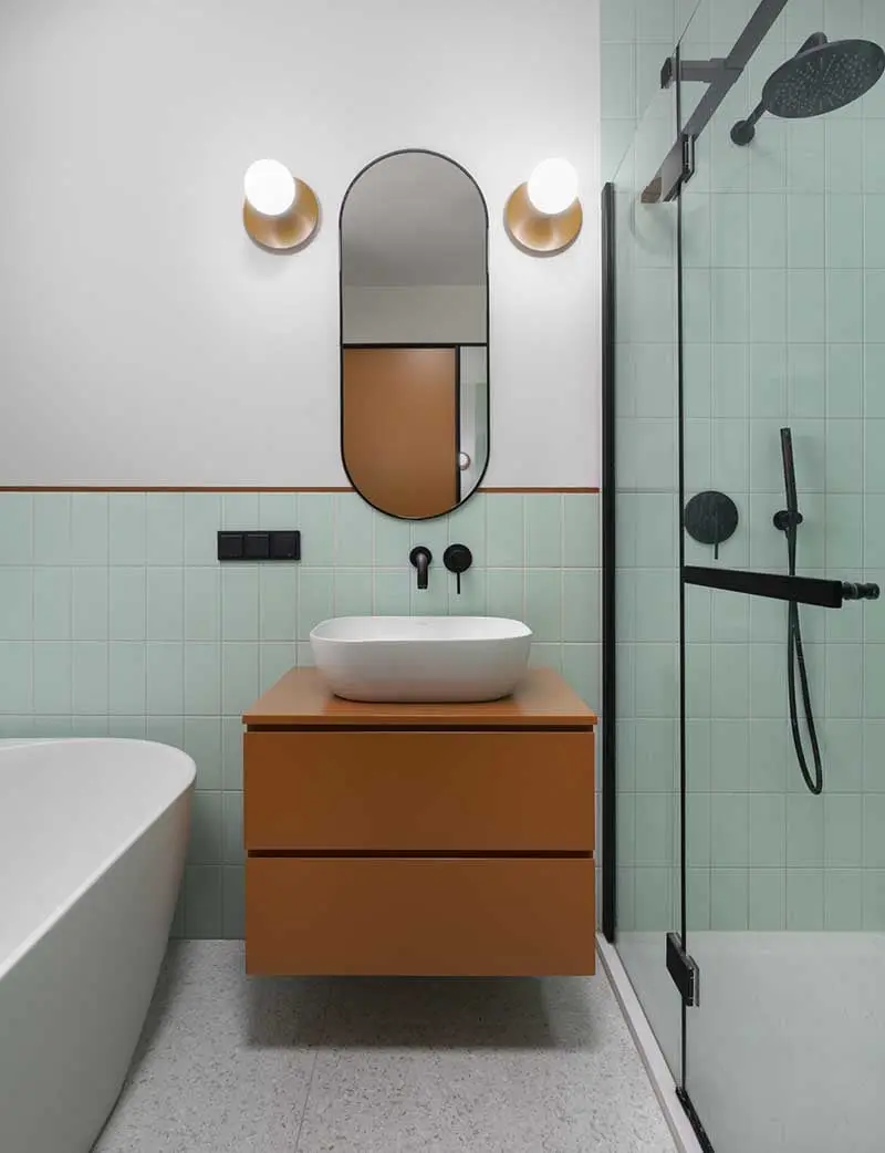 Hanna Stylińska z HAST Design podkreśla, że łazienka mieszkania jest świetnym przykładem, dlaczego nie należy bać się kolorów we wnętrzach. Aranżacja niczym z filmu Wesa Andersona, zachwyca pięknym odcieniem baby blue, połączonym z apetycznym karmelem. Wielkość łazienki pozwoliła na umieszczenie w niej zarówno dużego prysznica typu walk-in, jak i wanny. Dzięki temu powstał salon kąpielowy pełen pozytywnej energii. Podłogę pokrywają płytki o teksturze szarego lastryko, natomiast ściany zdobią błękitne cegiełki. Ciekawy wybór barw pięknie podkreśla czarna armatura oraz profil prysznica. Wyposażenie uzupełnia prosta, biała ceramika: wanna wolnostojąca oraz umywalka nablatowa.