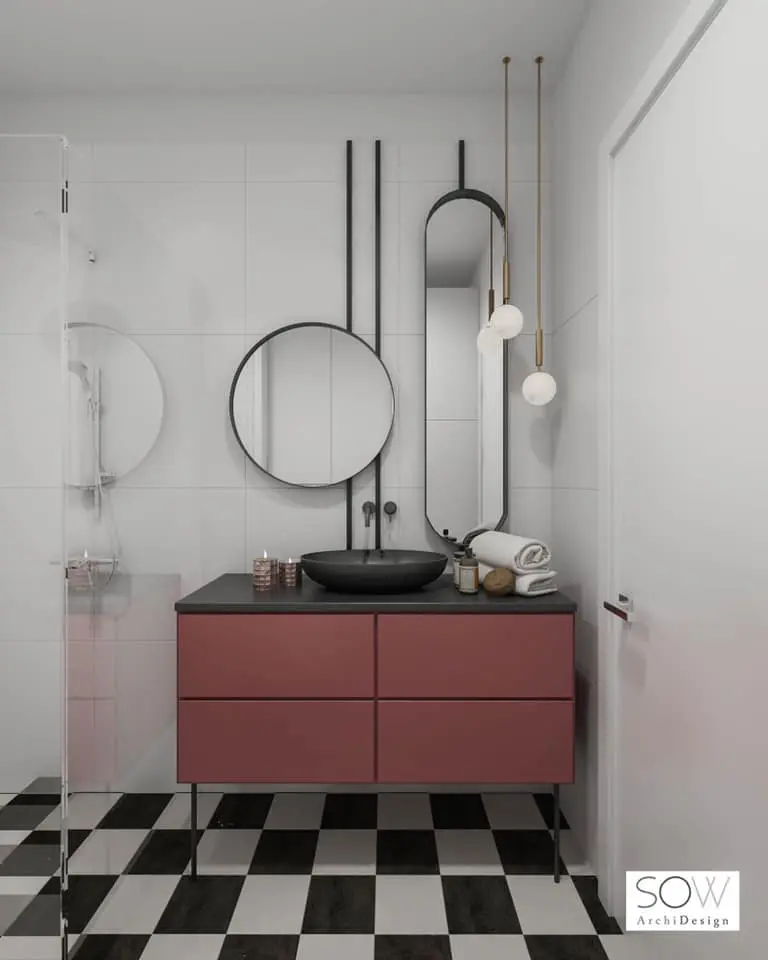Młoda para inwestorów, zdecydowała się na mocny akcent w całym mieszkaniu. Dzięki temu aranżacja jest spójna i płynna. Ten sam przewodni kolor odnajdziemy w łazience, jak również w przedpokoju. Bardzo ciekawy odcień malinowego, brudnego różu jest nietuzinkowy i oryginalny. Wspaniale współgra ze spokojnymi, stonowanymi szarościami.
