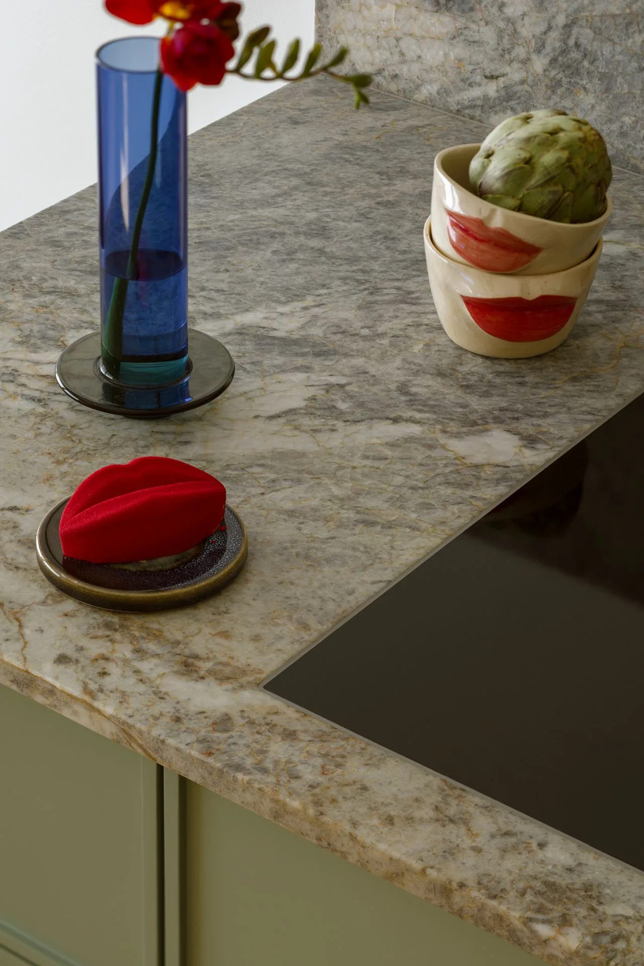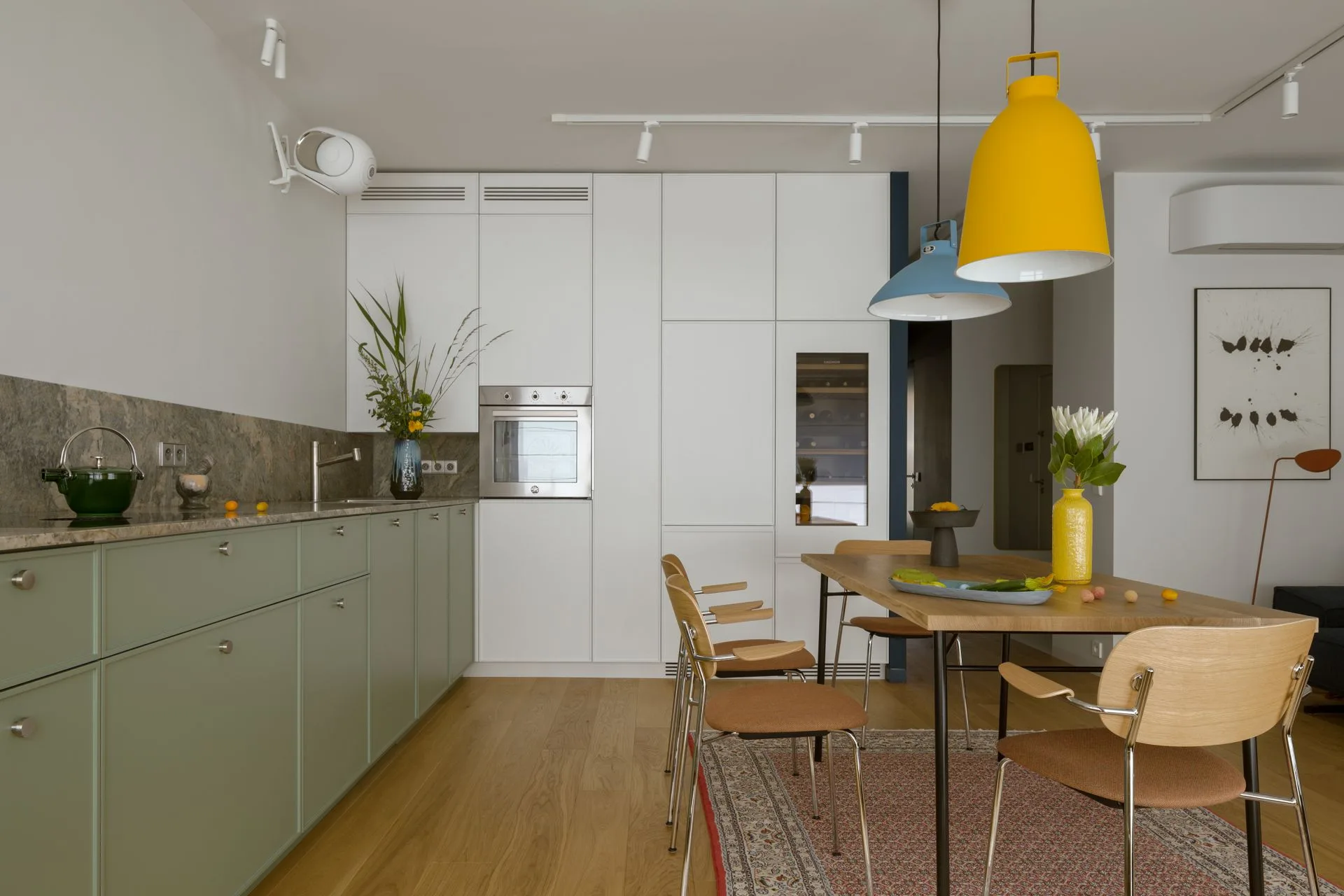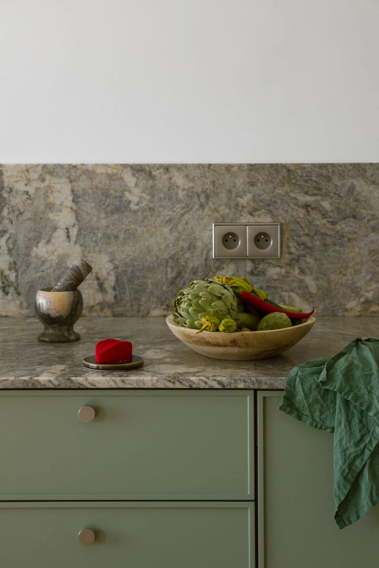 Estetyka wnętrza opiera się na balansie między prostotą kształtów a ekspresyjnością kolorów. Przemyślana paleta barw – od granatu, przez zielenie i czerwienie, po słoneczne żółcie – tworzy dynamiczną, rytmiczną całość. Surowce wybrane do realizacji nie są przypadkowe: naturalny kamień, matowe wykończenia, lniane tekstylia i ręcznie wykonywane lampy Jieldé budują narrację opartą na zmysłowym odbiorze przestrzeni. Całość dopełniają obrazy Łukasza Blikle, które wprowadzają dodatkowy wymiar ruchu i emocji.