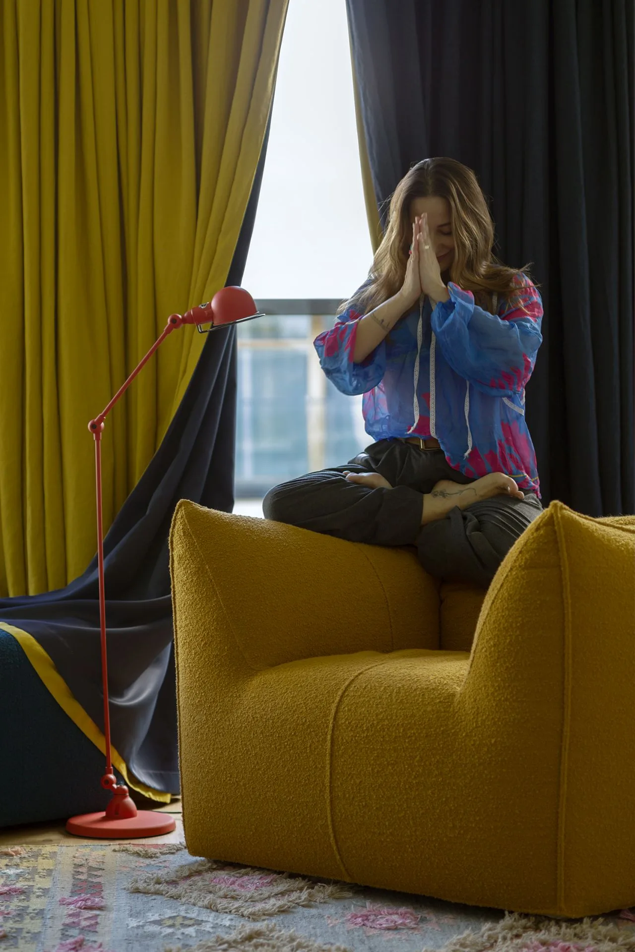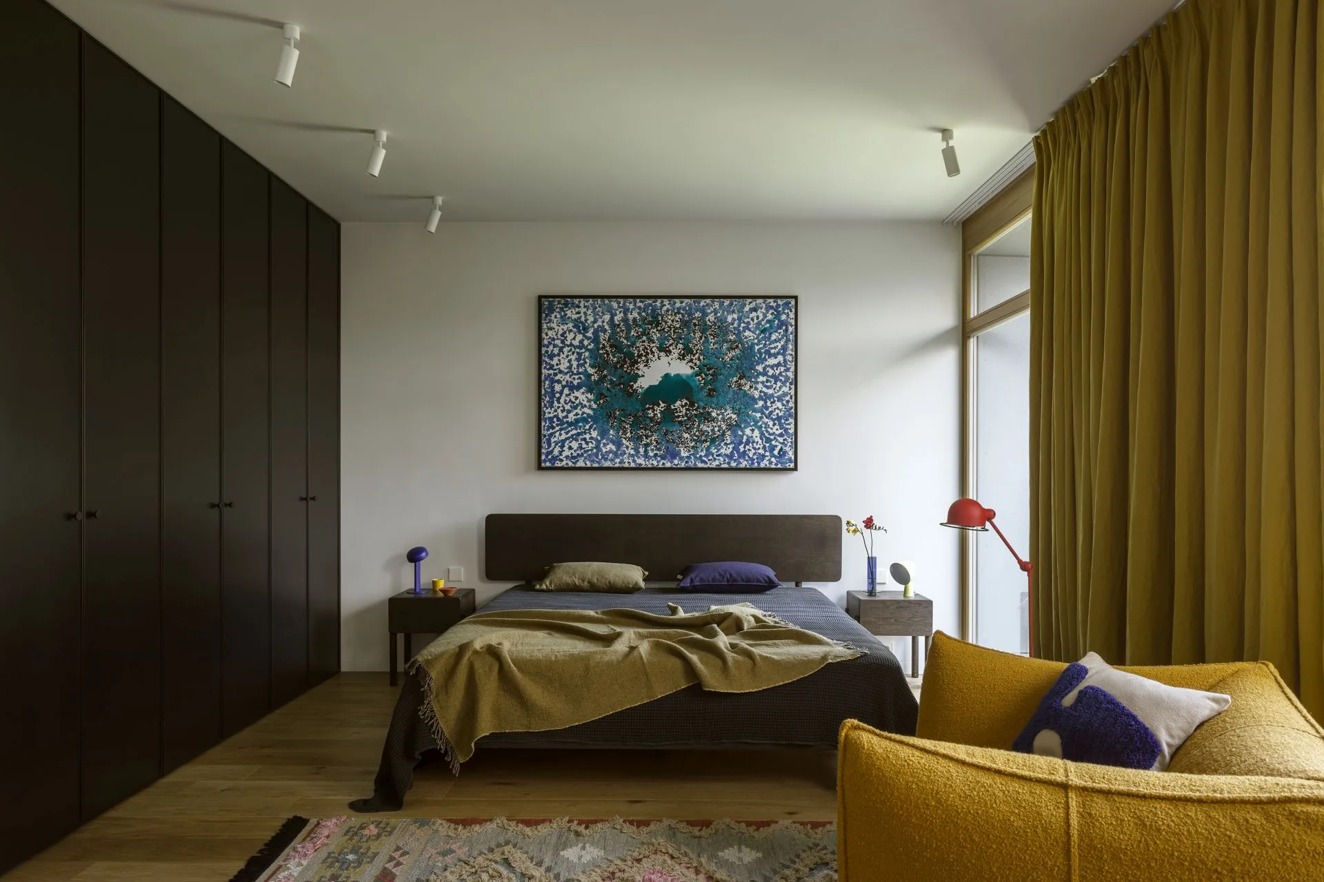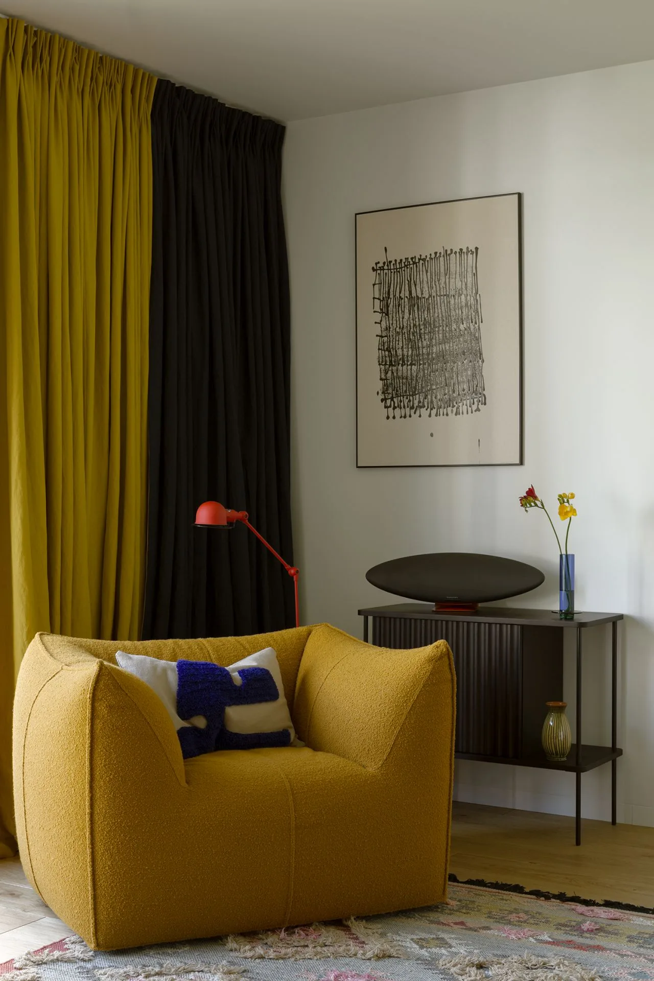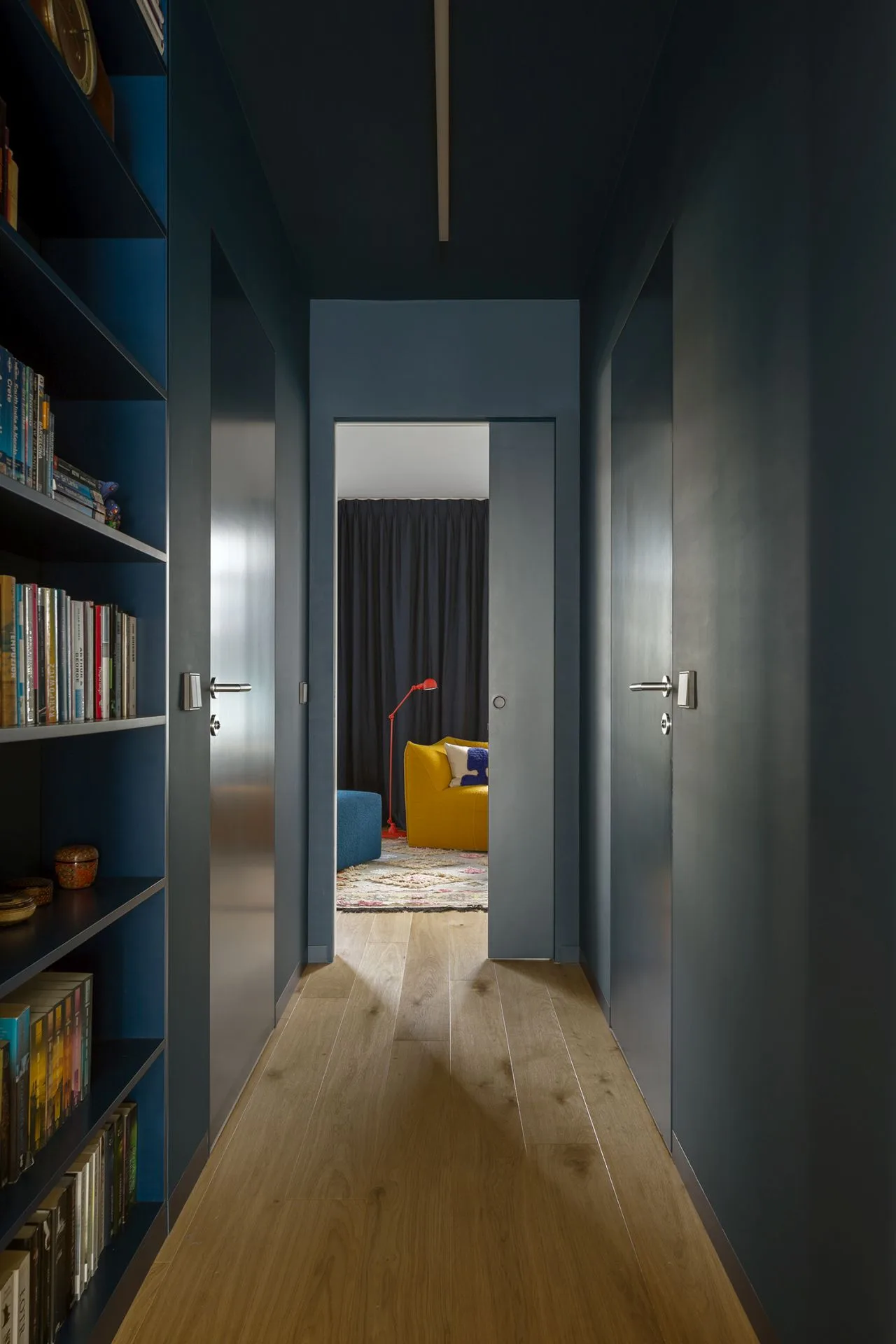 Korytarz prowadzący z salonu do sypialni urządzono w intensywnym granacie, który obejmuje także sufit. Ten głęboki, niemal filmowy kolor tworzy atmosferyczny tunel wiodący do sypialni. W jej wnętrzu królują kontrasty i dekoracyjna gra światła – teatralne zasłony, graficzne detale i odważne kolory budują przestrzeń wypoczynku. Znaleziono tu również miejsce na prywatną strefę relaksu z ikoną designu – fotelem Le Bambole.