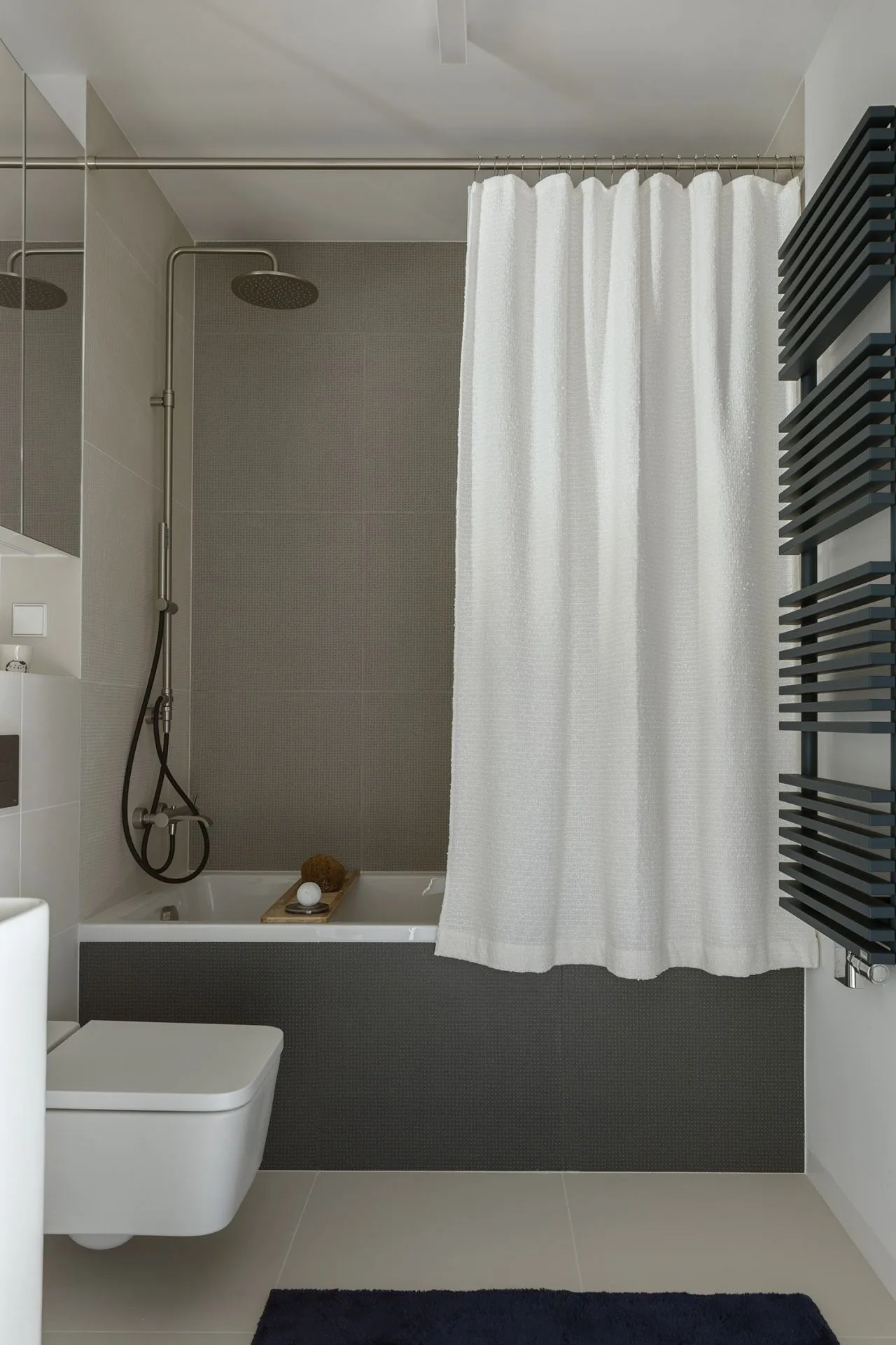 Łazienka to przestrzeń, w której struktura gra pierwsze skrzypce – różnorodne płytki Mutina w zestawieniu z lnianą zasłoną tworzą efektowną, a zarazem miękką kompozycję. Ten subtelny zabieg łamie typowy chłód minimalizmu. Projekt uzupełniają sprytnie ukryte garderoba i pralnia, w pełni zintegrowane z zabudowami stolarskimi