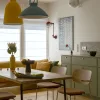 Estetyka wnętrza opiera się na balansie między prostotą kształtów a ekspresyjnością kolorów. Przemyślana paleta barw – od granatu, przez zielenie i czerwienie, po słoneczne żółcie – tworzy dynamiczną, rytmiczną całość. Surowce wybrane do realizacji nie są przypadkowe: naturalny kamień, matowe wykończenia, lniane tekstylia i ręcznie wykonywane lampy Jieldé budują narrację opartą na zmysłowym odbiorze przestrzeni. Całość dopełniają obrazy Łukasza Blikle, które wprowadzają dodatkowy wymiar ruchu i emocji.
