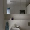 Łazienka to przestrzeń, w której struktura gra pierwsze skrzypce – różnorodne płytki Mutina w zestawieniu z lnianą zasłoną tworzą efektowną, a zarazem miękką kompozycję. Ten subtelny zabieg łamie typowy chłód minimalizmu. Projekt uzupełniają sprytnie ukryte garderoba i pralnia, w pełni zintegrowane z zabudowami stolarskimi