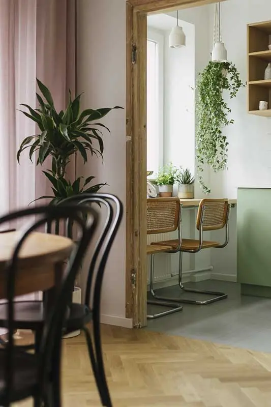 Wejście do salonu od strony kuchni prowadzi przez piękne, dwuskrzydłowe drzwi, które czekają na odnowienie. Przez oryginalną ościeżnicę, widać miętowe wnętrze kuchni, które harmonijnie koresponduje z kolorystyką pokoju dziennego. Tutaj barwy zostały uspokojone, a białe ściany stanowią idealne tło dla elementów wyposażenia. Przy oknie stoi okrągły stół vintage, uzupełniony o gięte krzesła marki Fameg. Kolejnym meblem vintage jest komoda, na której znajduje się ciekawa grafika, autorstwa architektek z Pigalopus. Akcenty barwne w pokoju dziennym pojawiają się w dodatkach, między innymi delikatnych zasłonach w kolorze pudrowego różu. Wprowadzenie do aranżacji czarnych elementów w postaci karniszy, krzeseł i lampy nad stołem, niweluje cukierkowy wydźwięk pasteli i nadaje całości charakteru. Mięta, róż i motyw vintage stanowią wyjątkowo harmonijne trio.