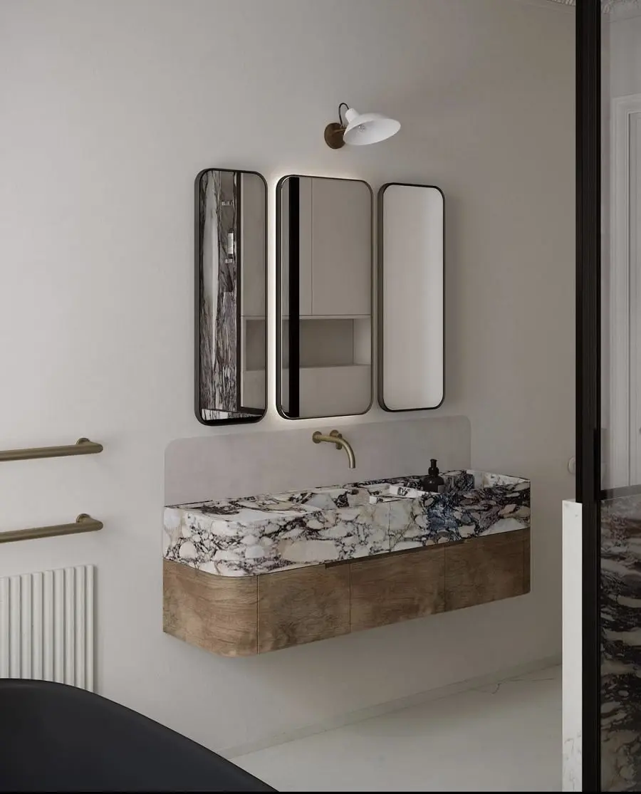 Szlachetny zarys marmuru na blacie oraz na ścianie gra tu pierwsze skrzypce, idealnie łączy się z drewnianą zaokrągloną zabudową kuchenną. Czarne ozdobne kinkiety oświetlają strefę roboczą kuchni. Wszystko jest tu perfekcyjnie dobrane.