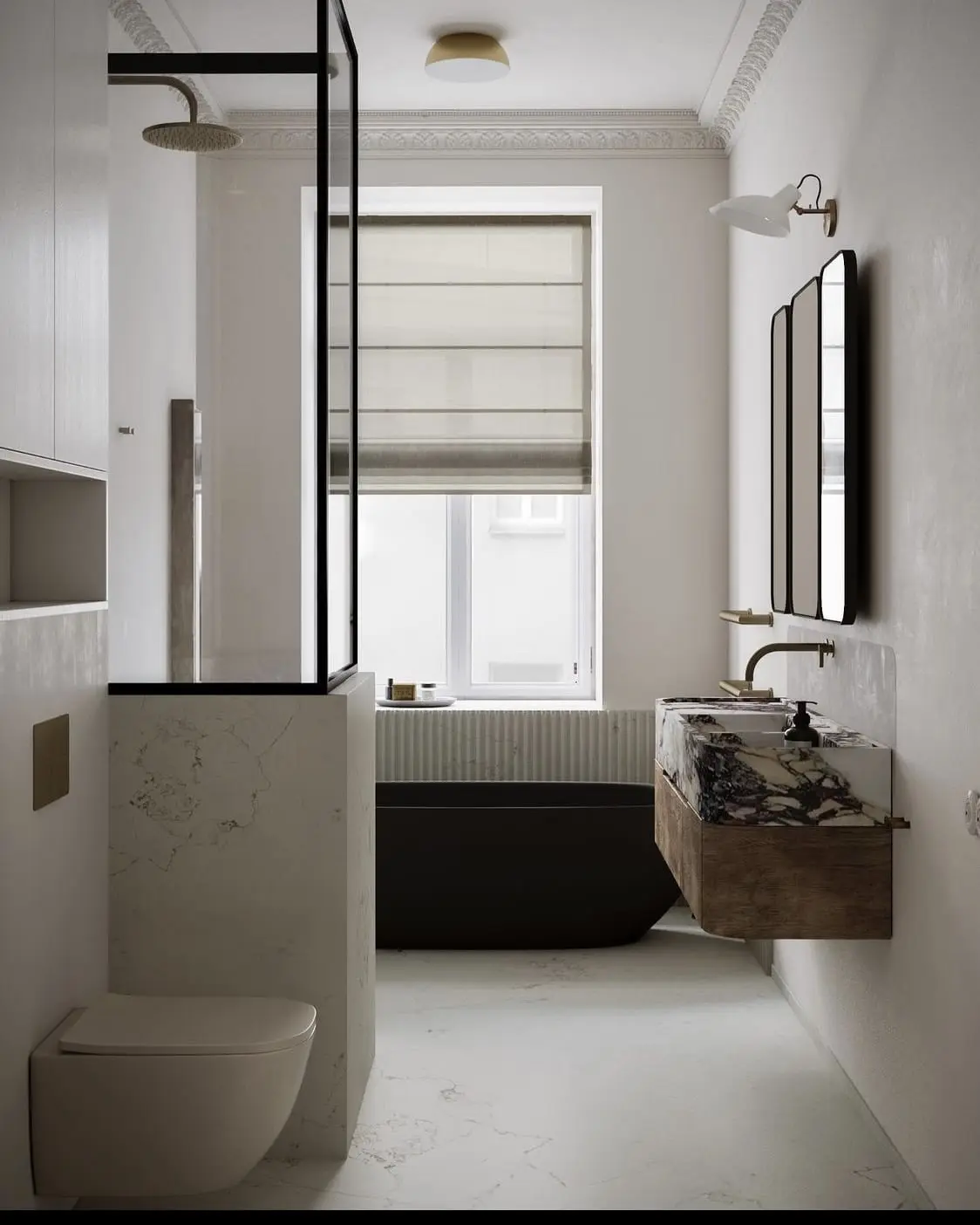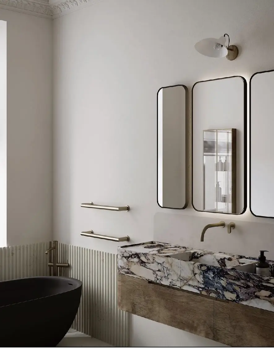 Łazienki zachwycają swoim wyjątkowym klimatem. Jasne z dużymi oknami, w nich również na ścianach znajduje się stylowa oryginalna sztukateria. Cudowne umywalki wykonane z marmuru zdobi armatura ze szczotkowanego złota.