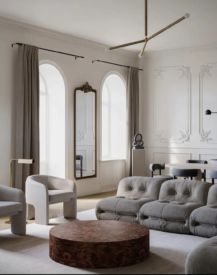 Paleta odcieni stylu naturalnego, organicznego czerpie kolory z bogactwa przyrody. To nienachalne, lekkie tonacje, które dają poczucie bezpieczeństwa i niewymuszonej elegancji. Początków stylu organicznego, zwanego też modernizmem humanistycznym, należy szukać w koncepcji architektury stworzonej pod koniec XIX wieku przez wybitnego architekta amerykańskiego Franka Lloyda Wrighta. Styl organiczny wciąż ewoluuje, dostosowując się do aktualnie panujących trendów. Ma jednak cechy, pozostające niezmienne od lat i odróżniające go od wielu innych sposobów urządzania wnętrz. W tym przepięknym salonie mamy wzornictwo o owalnych liniach i subtelnej formie, które różni się od tradycyjnej geometrii form.