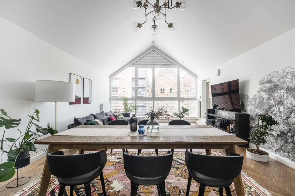 Elementem, który przykuwa spojrzenia wszystkich jest ściana z okien. Efekt jest tym bardziej spektakularny, że salon w najwyższym miejscu ma 4,2 m wysokości. Widoki też są niczego sobie. Zza okien możemy podziwiać zabytkowe spichlerze. O wyborny klimat i komfort mieszkańców dbają drewniane żaluzje, które nie tylko stoją na straży prywatności, ale też zapewniają niesamowite efekty świetlne we wnętrzu.