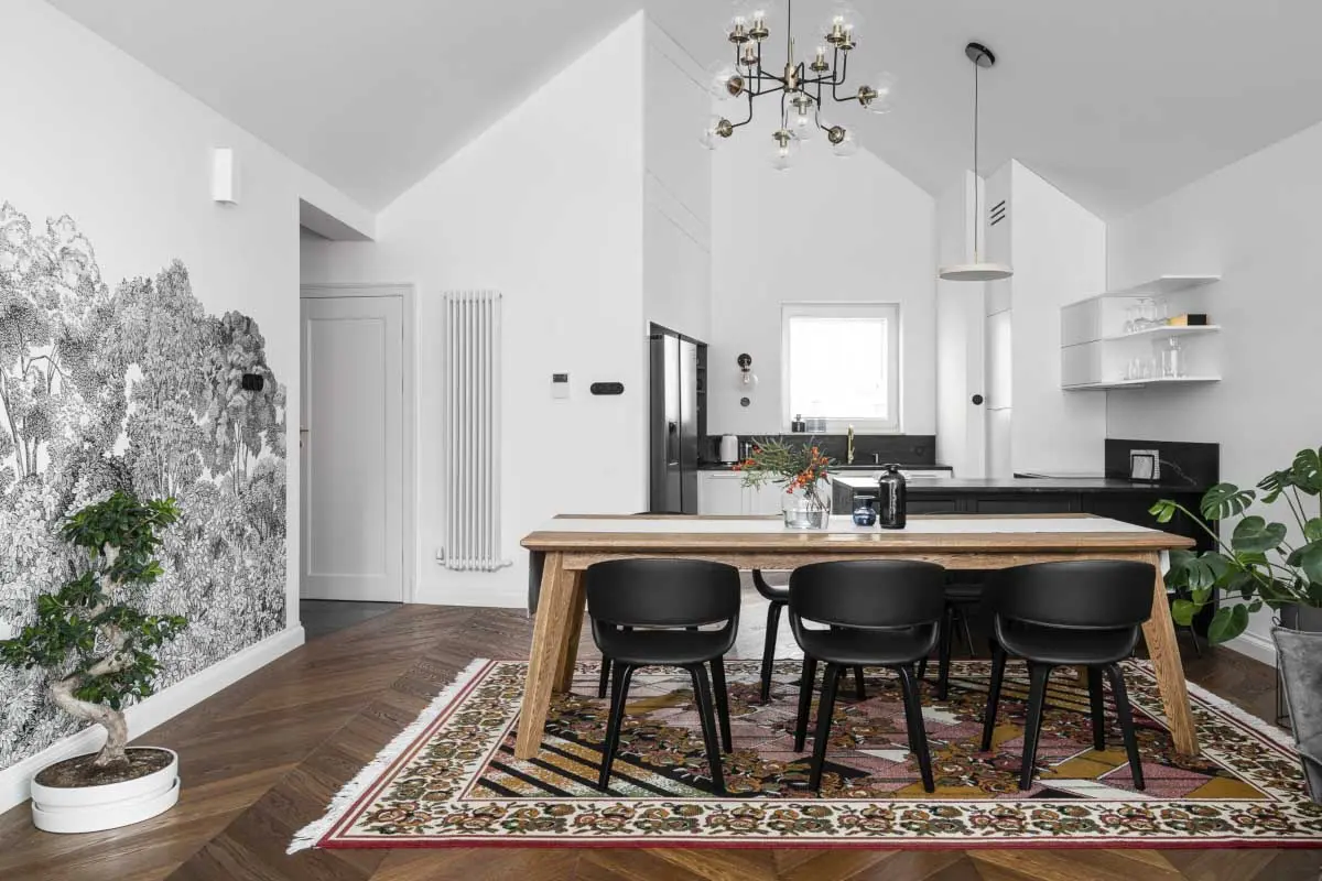 Centrum salonu stanowi wygodna sofa. Za klimat rodem z francuskim kamienic odpowiada parkiet ze szczotkowanego dębu, którego uzupełnienie stanowi drewniany stół wykonany na specjalnie zamówienie. Wisienką na torcie jest nieco orientalny dywan, który pomimo że jest już parę lat w rodzinie, nikt za bardzo nie zna jego pochodzenia. Sztuka dopełniająca salon to autorski projekt architektki stworzony specjalnie na potrzeby tego wnętrza.