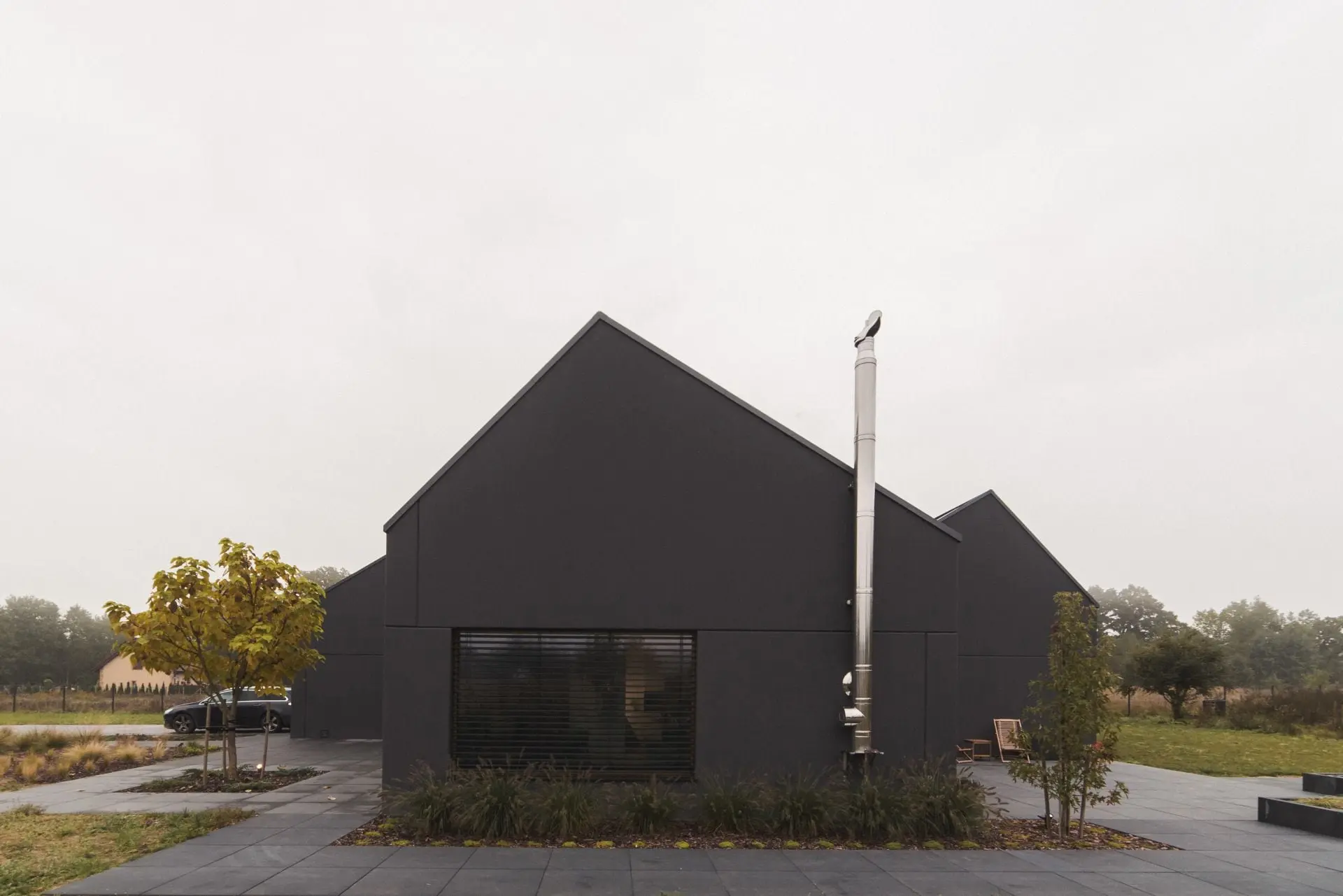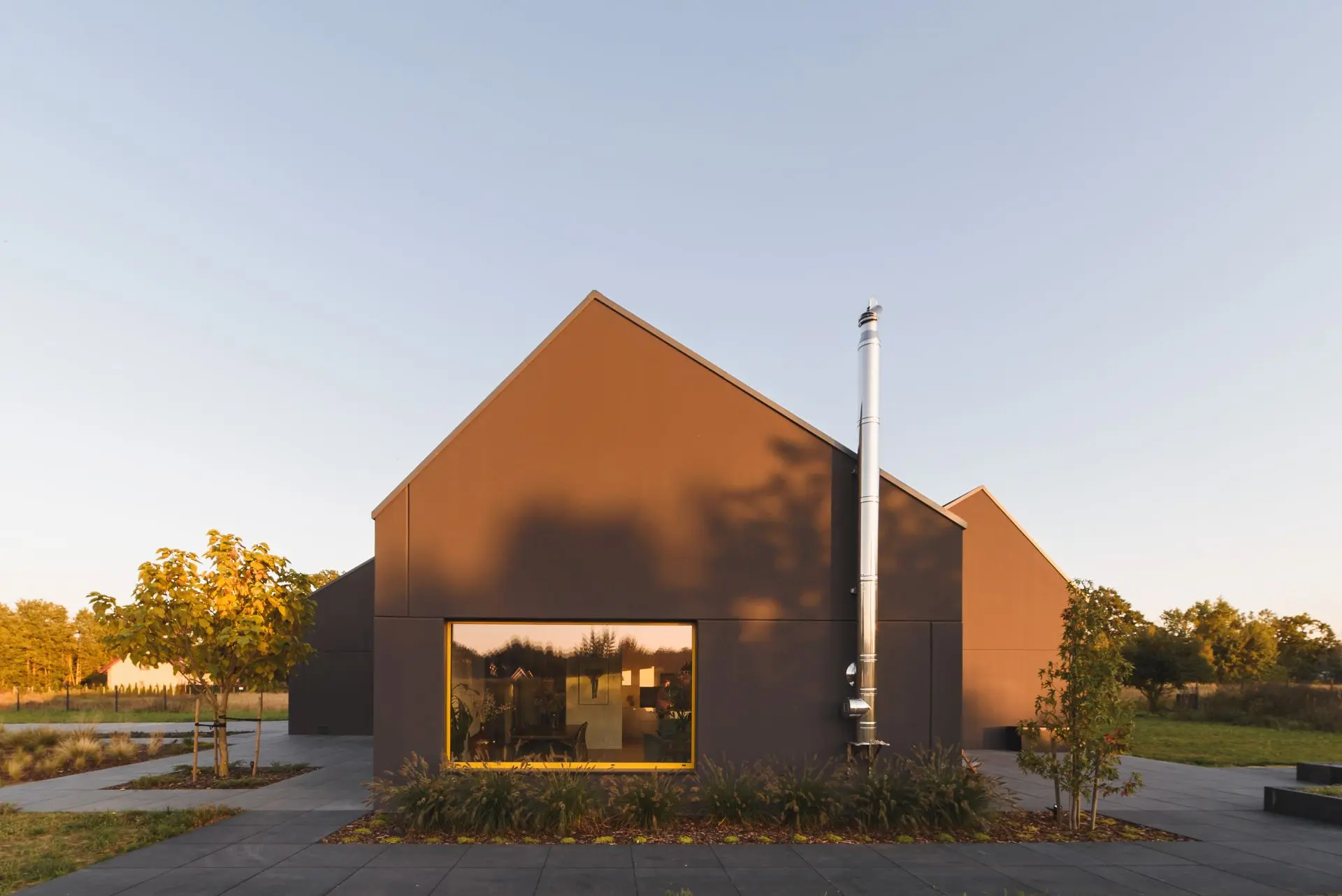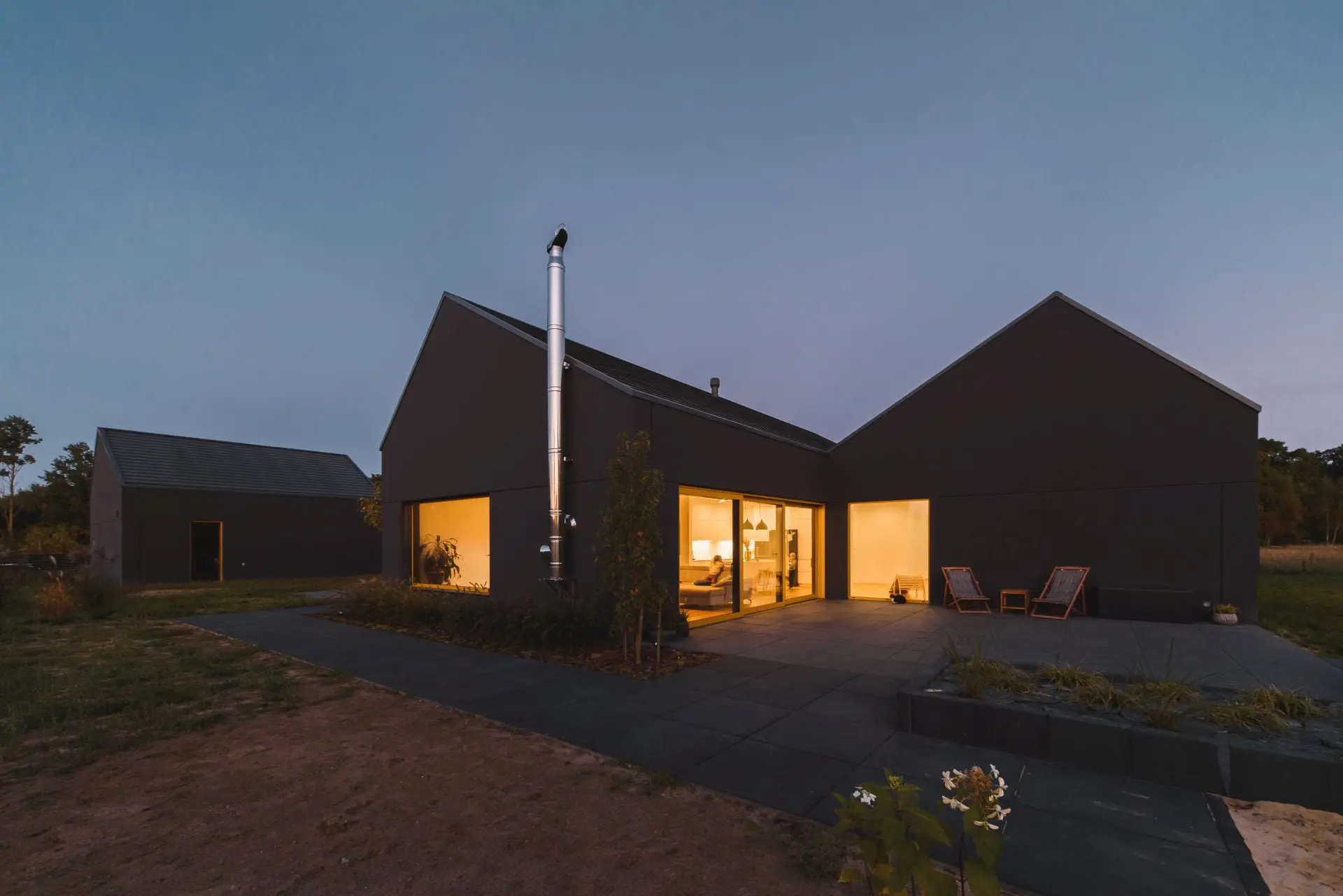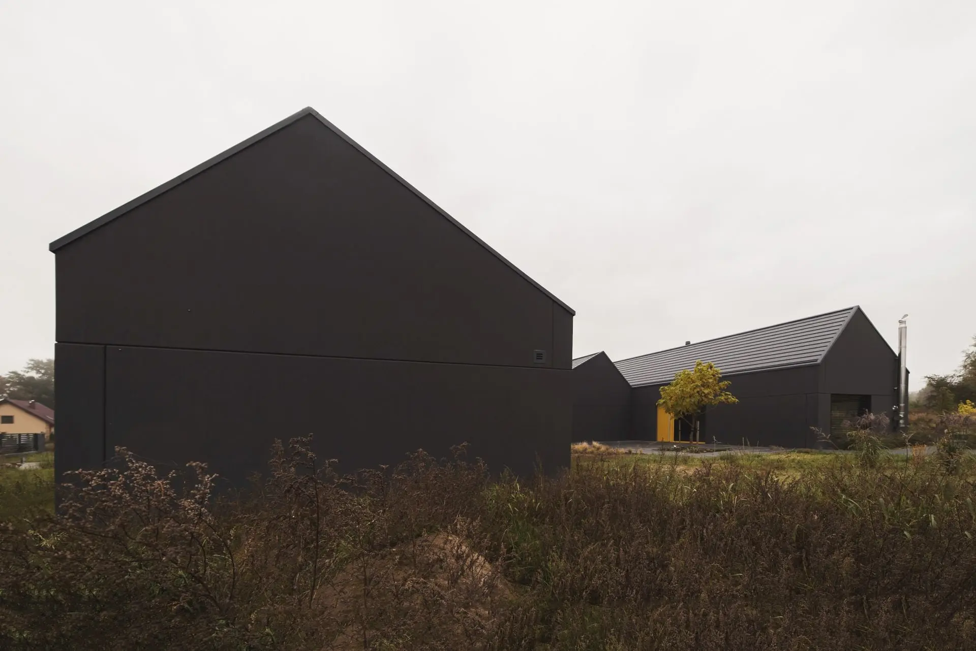to parterowy budynek składający się z trzech połączonych ze sobą segmentów – w formie każdego z nich można dostrzec inspiracje wiejską stodołą. To proste bryły z dwuspadowymi, asymetrycznymi dachami. Obok znajduje się wolno stojący garaż o podobnym kształcie.
