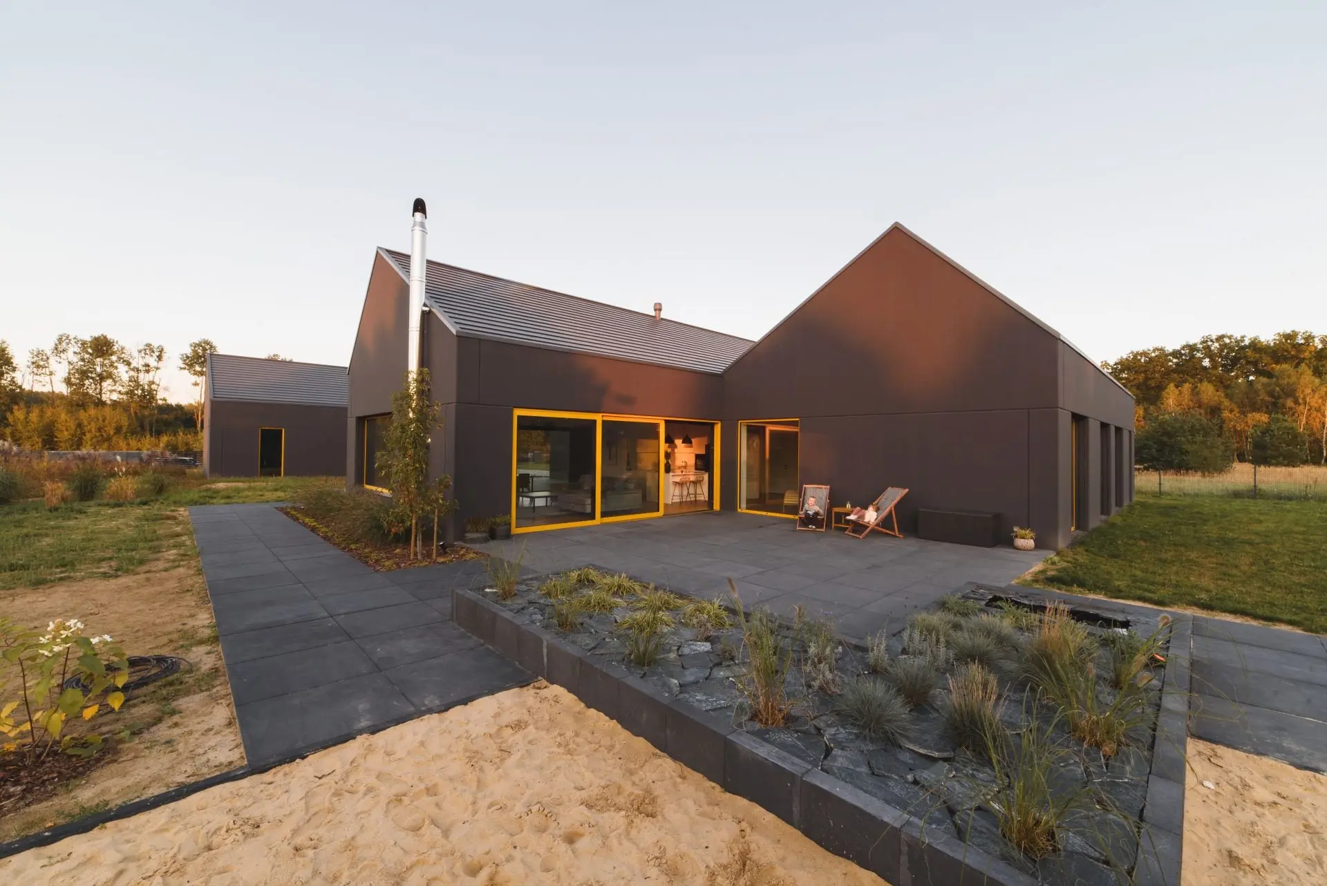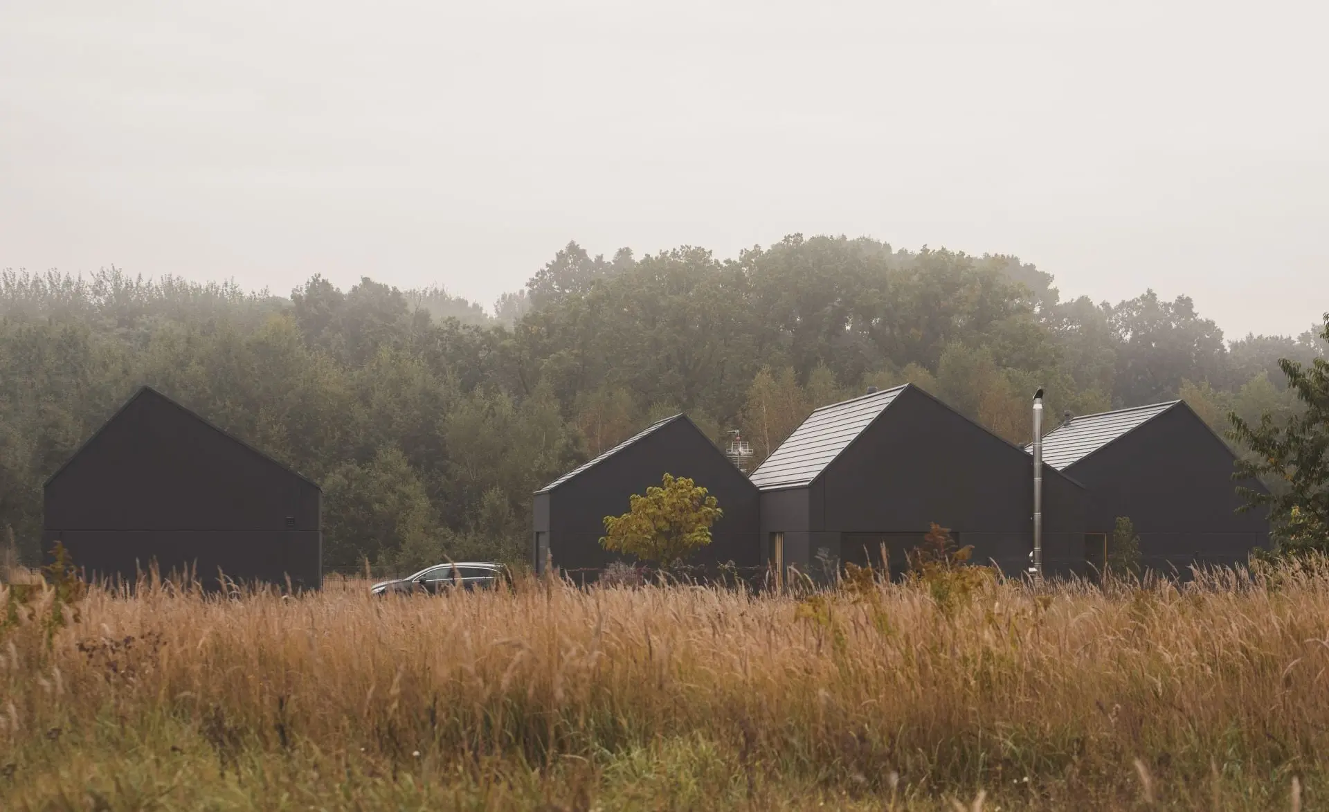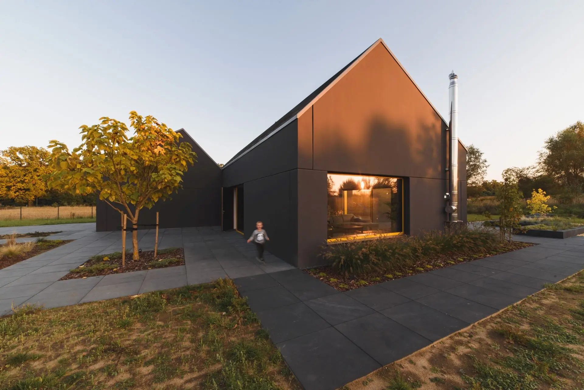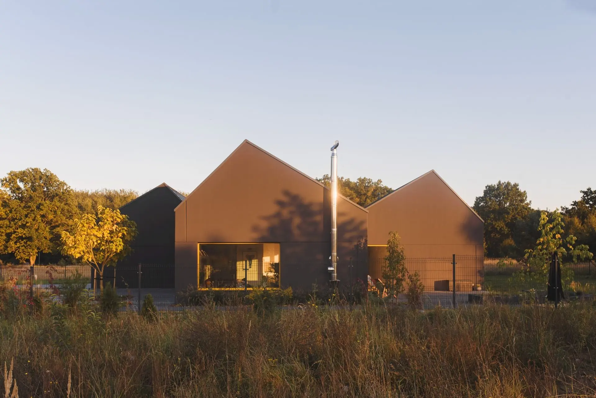 to parterowy budynek składający się z trzech połączonych ze sobą segmentów – w formie każdego z nich można dostrzec inspiracje wiejską stodołą. To proste bryły z dwuspadowymi, asymetrycznymi dachami. Obok znajduje się wolno stojący garaż o podobnym kształcie.