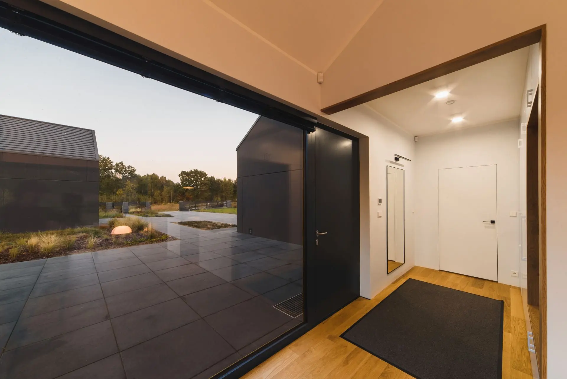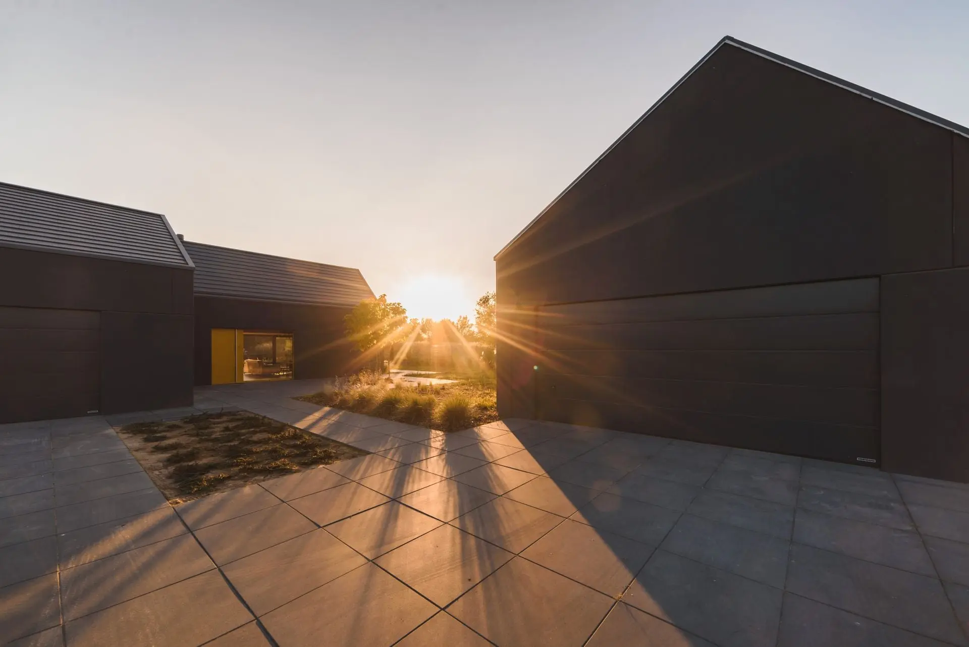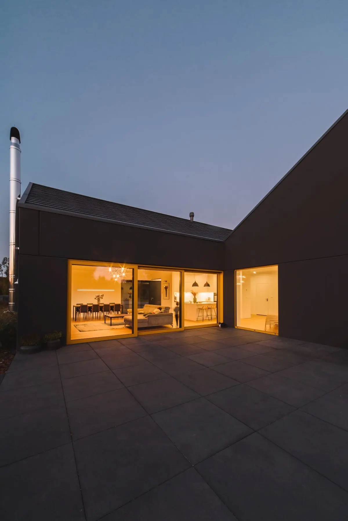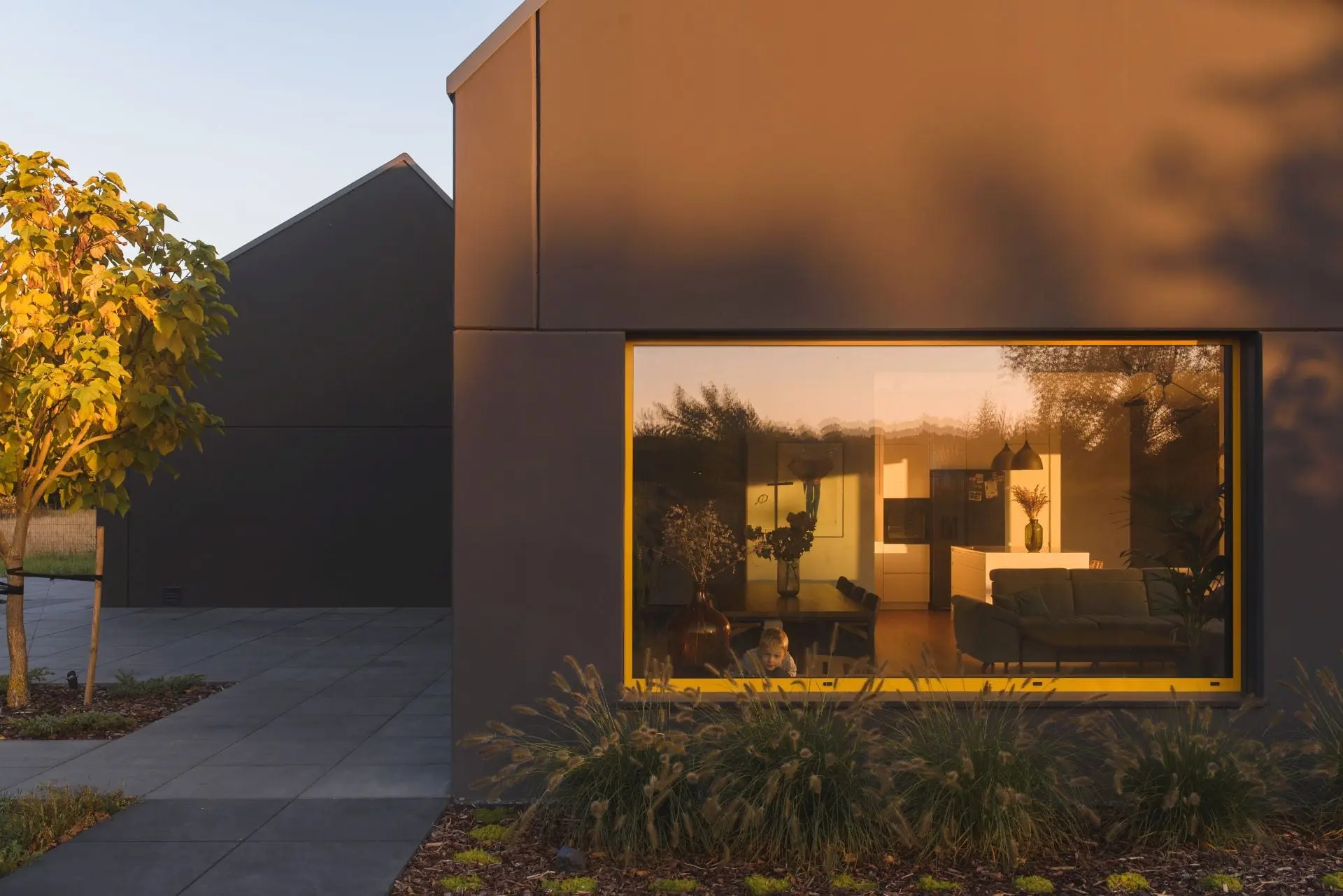 Elewacja domu oraz dachy mają grafitowy kolor, który podkreśla minimalistyczną bryłę. Jedynym akcentem kolorystycznym są miodowożółte, aluminiowe ramy okien oraz drzwi wejściowe w tym samym odcieniu. Subtelną dekorację stanowią także pionowe i poziomie linie – miejsca łączenia prefabrykowanych płyt betonowych, z których został zbudowany dom. Oszczędną formę podkreślają duże przeszklenia bez podziałów, dzięki którym do wnętrza z każdej strony wpada światło dzienne. Aby zachować prostotę bryły architekt zdecydował się na ukrycie rynien i rur spustowych. Dziedziniec między budynkami został wyłożony ciemnymi płytami chodnikowymi.