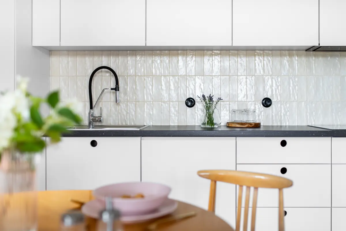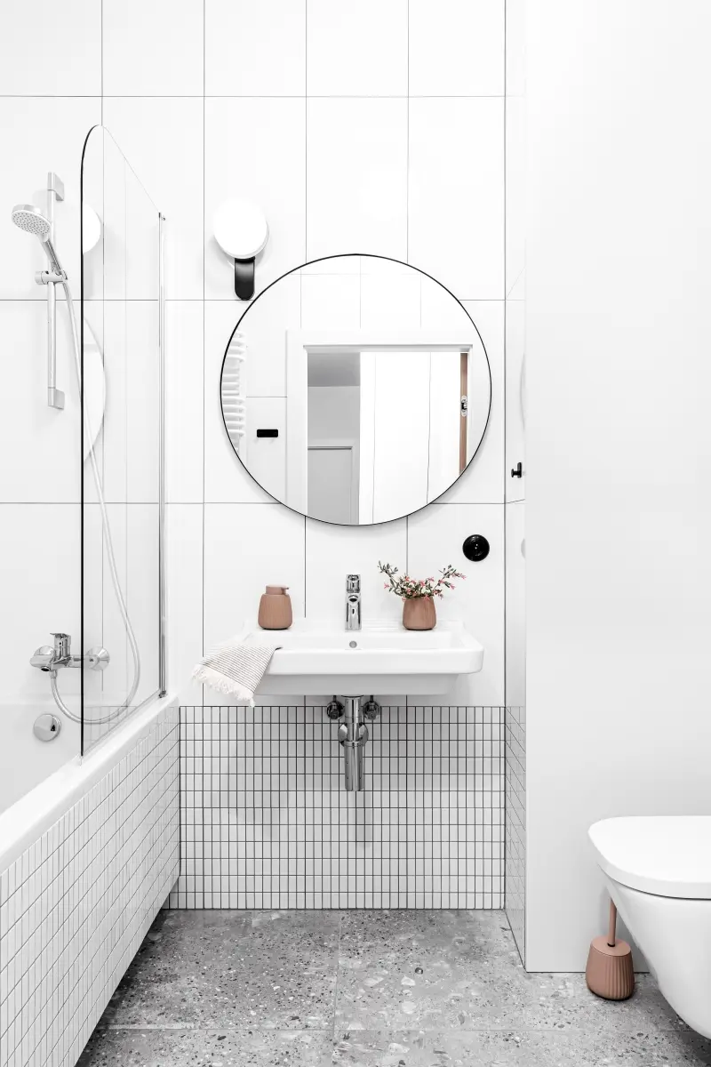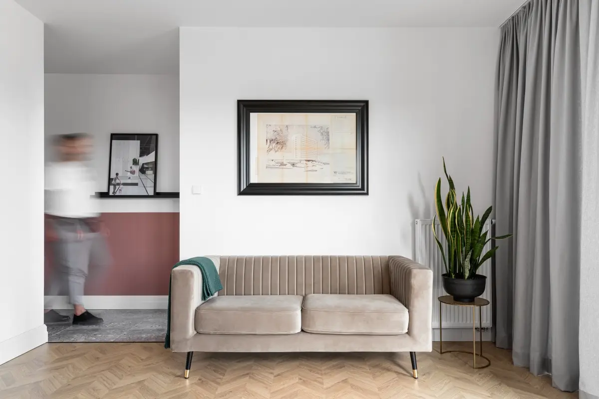 Monochromatyczne tło barwne przełamują różowe akcenty. Architekci wybrali stonowany odcień z domieszką fioletu, nawiązujący do koloru terakoty, której tonacja oscyluje między pomarańczem, ceglaną czerwienią, brązem, a właśnie różem. Kolor ten wybrano dla lamperii, zdobiącej ściany korytarza. Kontynuacje różowego akcentu odnajdziemy na tapicerce mebli w salonie oraz dodatkach. Odcień wybrany przez pracownię idealnie komponuje się z szarym lastryko, pokrywającym podłogę korytarza, aneksu kuchennego oraz łazienki. Na ścianie holu znalazł się kolejny motyw vintage – lustro w ponad 80-letniej, ręcznie rzeźbionej ramie. Architekci wygospodarowali, także dwie sypialnie z czego jedna może pełnić rolę domowego biura. Geometryczna łazienka w duchu bauhausu wyłożona została białymi płytkami w dwóch formatach. Wysoki cokół sięgający górnej krawędzi wanny to mała mozaika, powyżej większe prostokąty. Okrągłe lustro, kuliste oświetlenie oraz gniazdo elektryczne to nawiązanie do obłości pojawiających się w reszcie mieszkania. Natomiast różowy akcent pojawił się pod postacią przyborów łazienkowych.