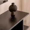 Tłem dla tej niebanalnej kompozycji jest aneks kuchenny, gdzie znajduje się zabudowa z frontami z aluminium oraz elegancki blat z naturalnego granitu Crema Terra. Otwarta półka dodaje przestrzeni lekkości i umożliwia ekspozycję przedmiotów codziennego użytku.