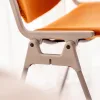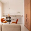 Na rzecz ocieplenia tego minimalistycznego wnętrza, działają również mocne plamy soczystej barwy. Pomarańcz na designerskich krzesłach (model DSC 106 autorstwa Giancarlo Piretti’ego) ożywia przestrzeń wokół czarnego okrągłego stołu stanowiącego centralny punkt strefy dziennej. Aby nie uzyskać przeskalowanego efektu, proporcje wyrównuje wisząca mikro lampa.